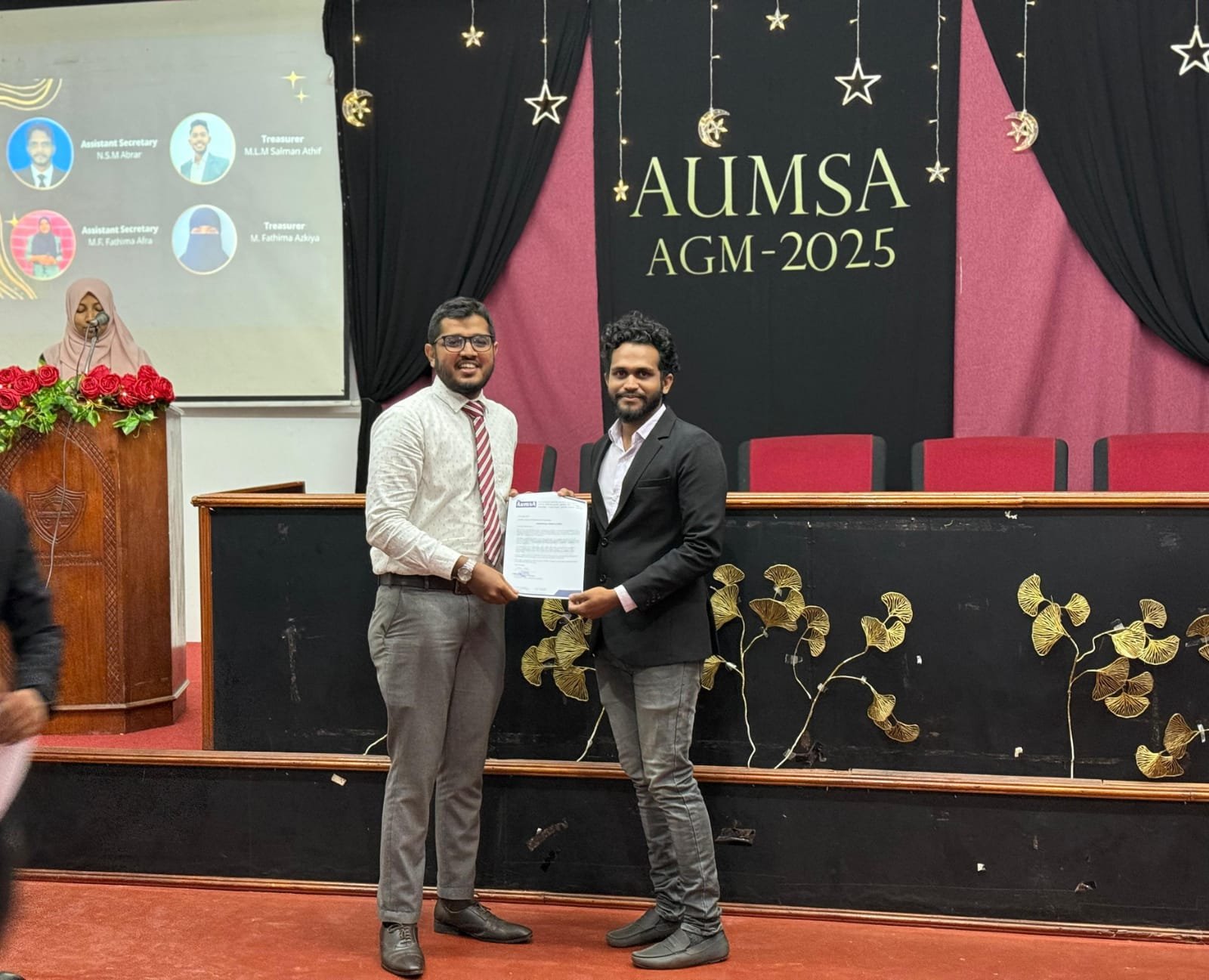 இவ்அமைப்பின் தலைவர் எம்.ஸட்.எம். ஹம்மாத் தலைமையில் கொழும்பு மருதானையில் வை.எம்.எம்.ஏ (YMMA) யின் கேட்போர் கூடத்தில் இன்று ஞாயிற்றுக்கிழமை இடம்பெற்ற வருடாந்த பொது கூட்டத்தில் தெரிவு செய்யப்பட்ட நிர்வாக உறுப்பினர்களுக்கான நியமன கடிதங்கள் வழங்கி வைக்கும் நிகழ்வில் கடந்த வருடம் செப்டம்பர் மாதம் இடம் பெற்ற நேர்முகத் தேர்வில் உப செயலாளராக தெரிவு செய்யப்பட்ட சம்மாந்துறை அப்றாருக்கு முன்னால் அனைத்து பல்கலைக்கழக முஸ்லிம் மாணவர்கள் ஒன்றியத்தின் தலைவர் ஹம்மாத் ஸுஹைம்களினால் நியமனக் கடிதம் வழங்கி கெளரவிக்கப்பட்டது.