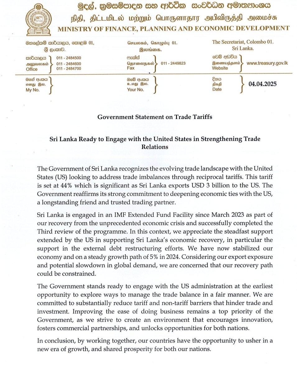 நிதி அமைச்சகம் வெயிட்டுள்ள ஒரு அதிகாரப்பூர்வ அறிக்கையில், இலங்கை ஏற்றுமதிகள் மீது 44சதவீதம் அமெரிக்க வரி விதிக்கப்படுவது குறித்த தனது கவலைகளை எடுத்துரைத்துள்ளது, இது ஆண்டுதோறும் 3 பில்லியன் அமெரிக்க டாலர்கள் ஆகும் எனவும் இதில் சுட்டிக்காட்டப்பட்டுள்ளது.