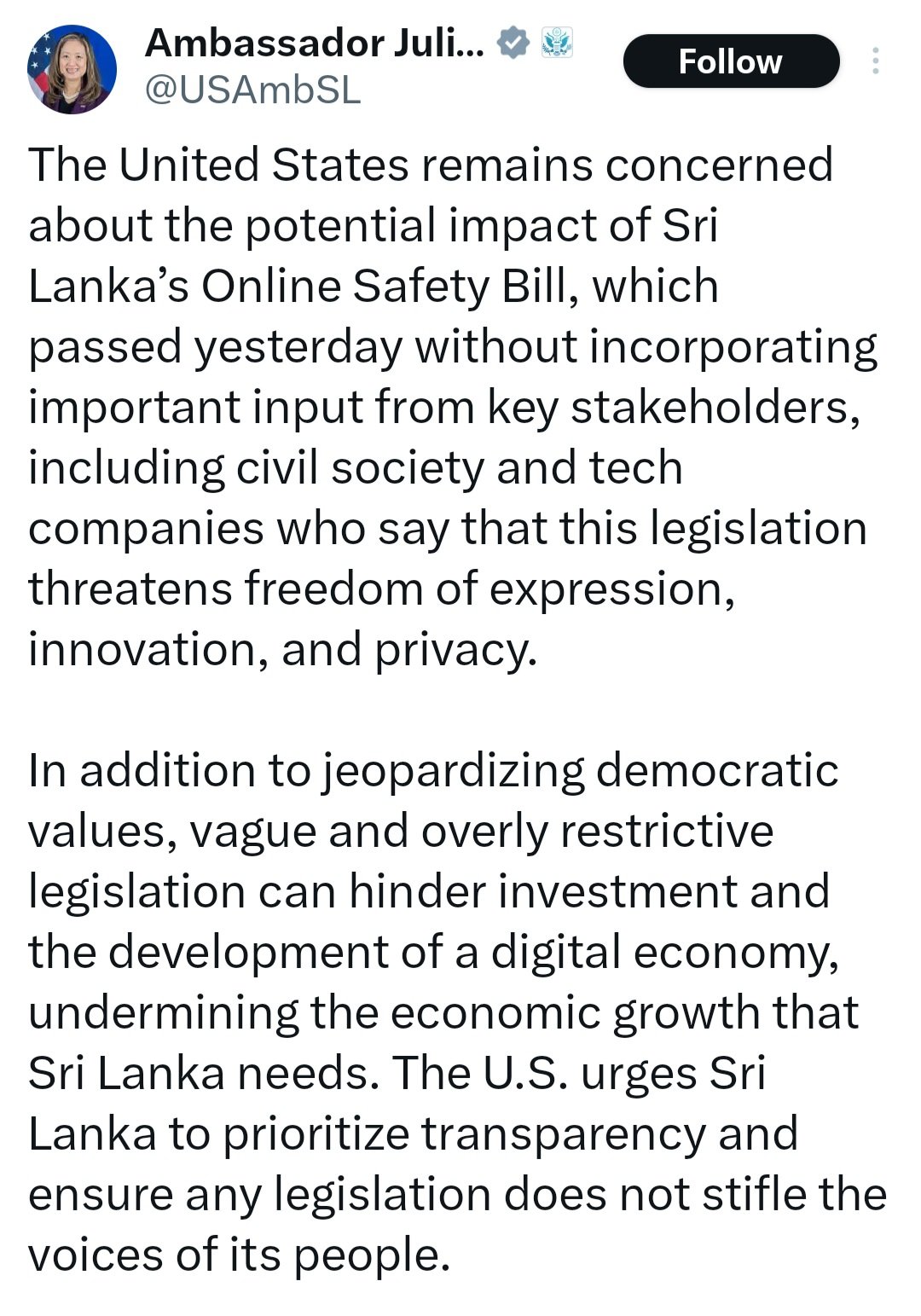 இலங்கைக்கான அமெரிக்க தூதுவர் ஜூலி சங் தமது எக்ஸ் பக்கத்தில் இதனை தெரிவித்துள்ளார்.