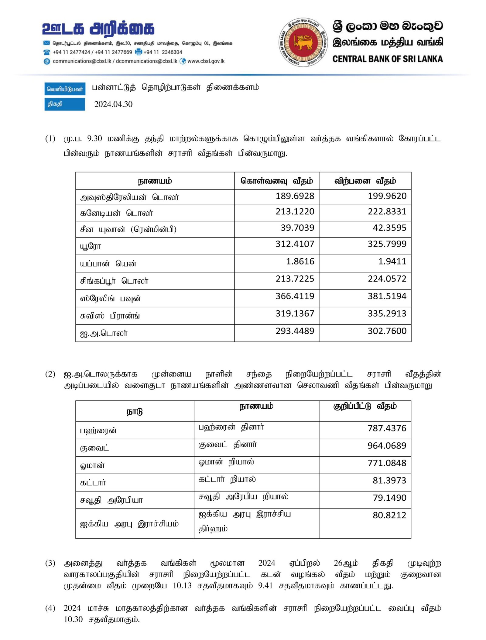 அத்துடன், அமெரிக்க டொலர் ஒன்றின் விற்பனைப் பெறுமதி 302 ரூபாய் 76 சதமாக பதிவாகியுள்ளது.