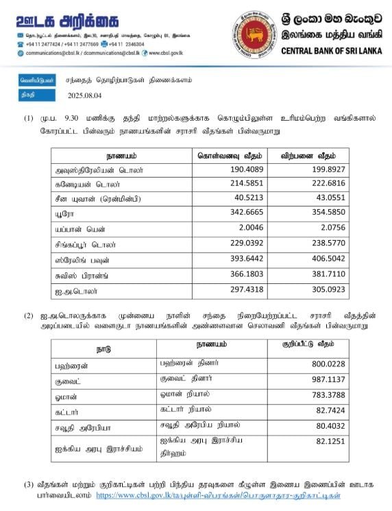 இலங்கை மத்திய வங்கி இன்று வெளியிட்டுள்ள நாணயமாற்று விகிதங்களின் படி,