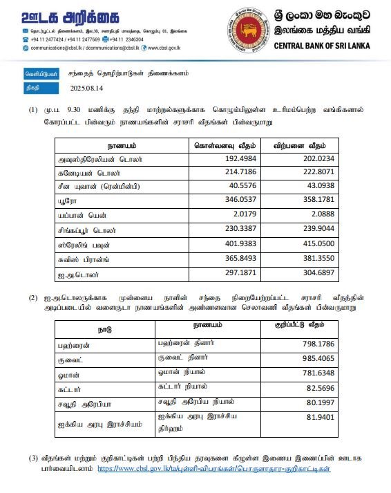 இலங்கை மத்திய வங்கி இன்று வியாழக்கிழமை வெளியிட்டுள்ள நாணயமாற்று விகிதங்களின் படி,