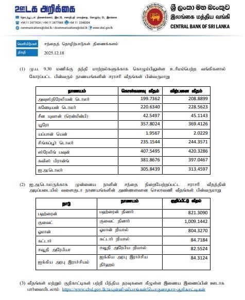 இலங்கை மத்திய வங்கி இன்று வியாழக்கிழமை வெளியிட்டுள்ள நாணயமாற்று வீதத்தின்படி,
