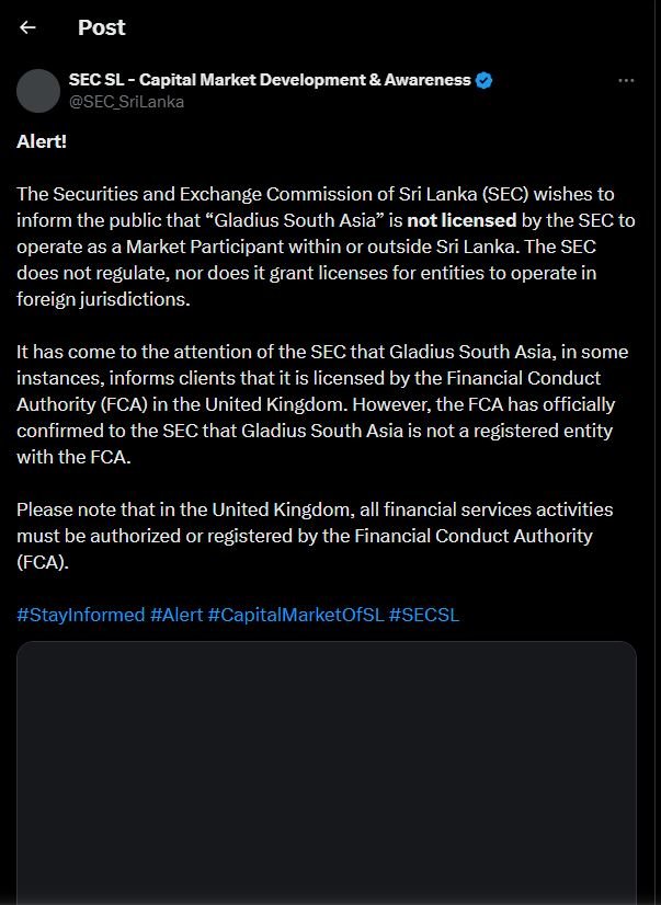 தமது உத்தியோகபூர்வ தளத்தில் அறிக்கை ஒன்றை வெளியிட்டுள்ள இலங்கைப் பத்திரங்கள் மற்றும் பரிவர்த்தனை ஆணைக்குழு (SEC), கிளாடியஸ் தெற்காசியா என்ற நிறுவனத்துக்கு வெளிநாட்டு அதிகார வரம்புகளில் செயல்படுவதற்கான உரிமங்களை வழங்க இல்லை என தெரிவித்துள்ளது.