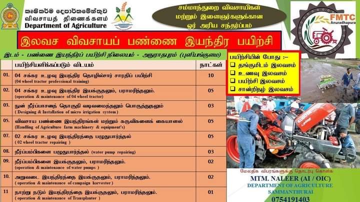 இலங்கை விவசாய திணைக்களத்தினால் நடத்தப்படும் “இலவச விவசாய பண்ணை இயந்திர பயிற்சி” அநுராதபுரத்தில் (புளியங்குளம்) எனும் இடத்தில் நடைபெற உள்ளது.
