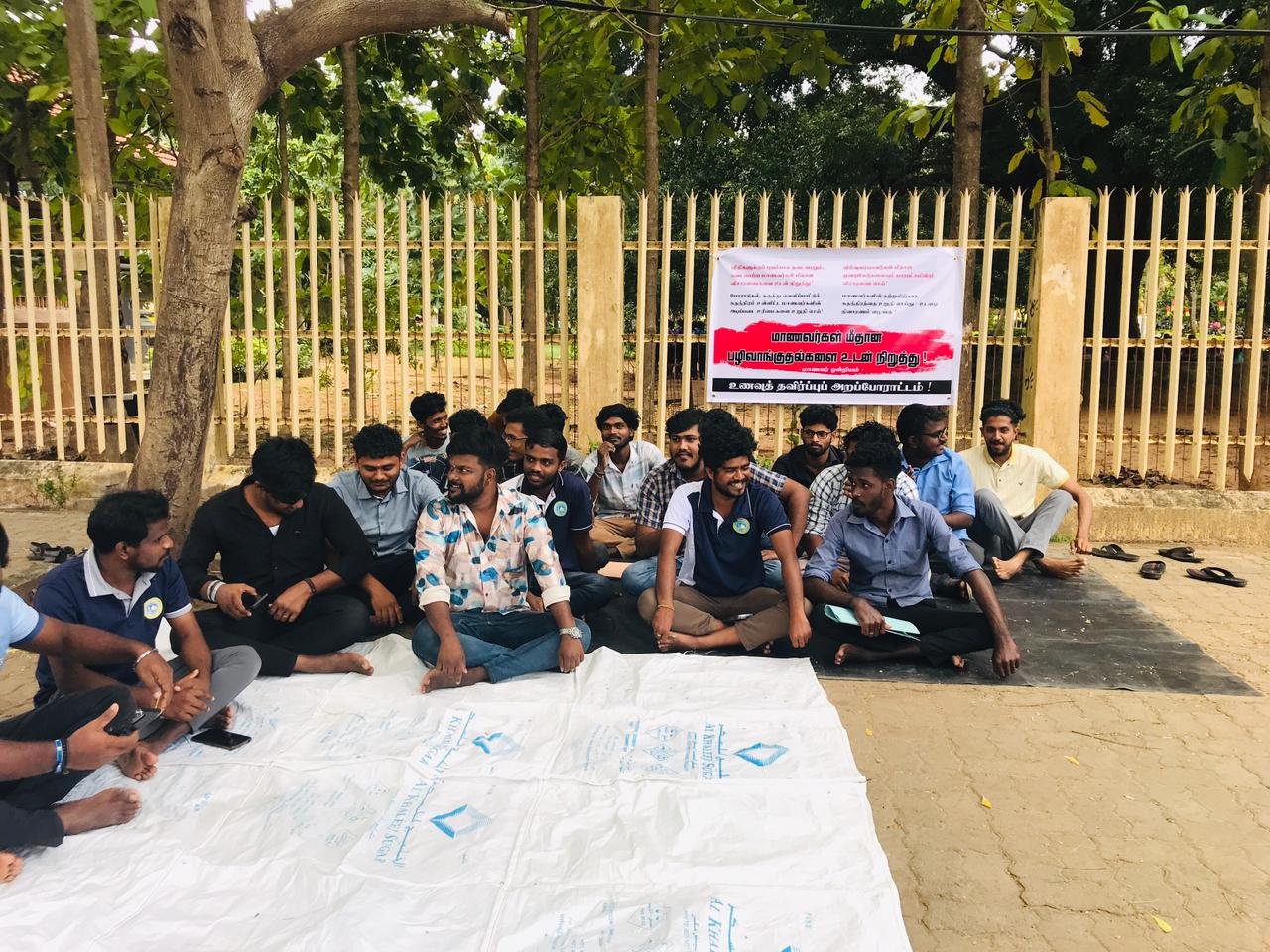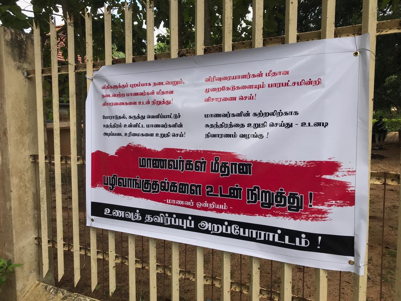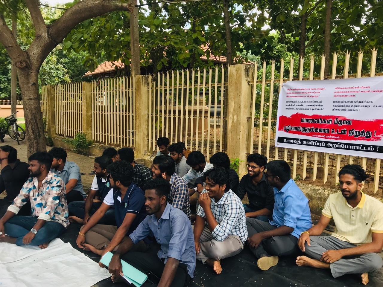 உள்ளிட்ட கோரிக்கைகளை முன்வைத்து தீர்வு கிடைக்கும் வரை உணவுத்தவிர்ப்புப் போராட்டத்தில் மாணவர்கள் ஈடுபட்டுள்ளனர்.