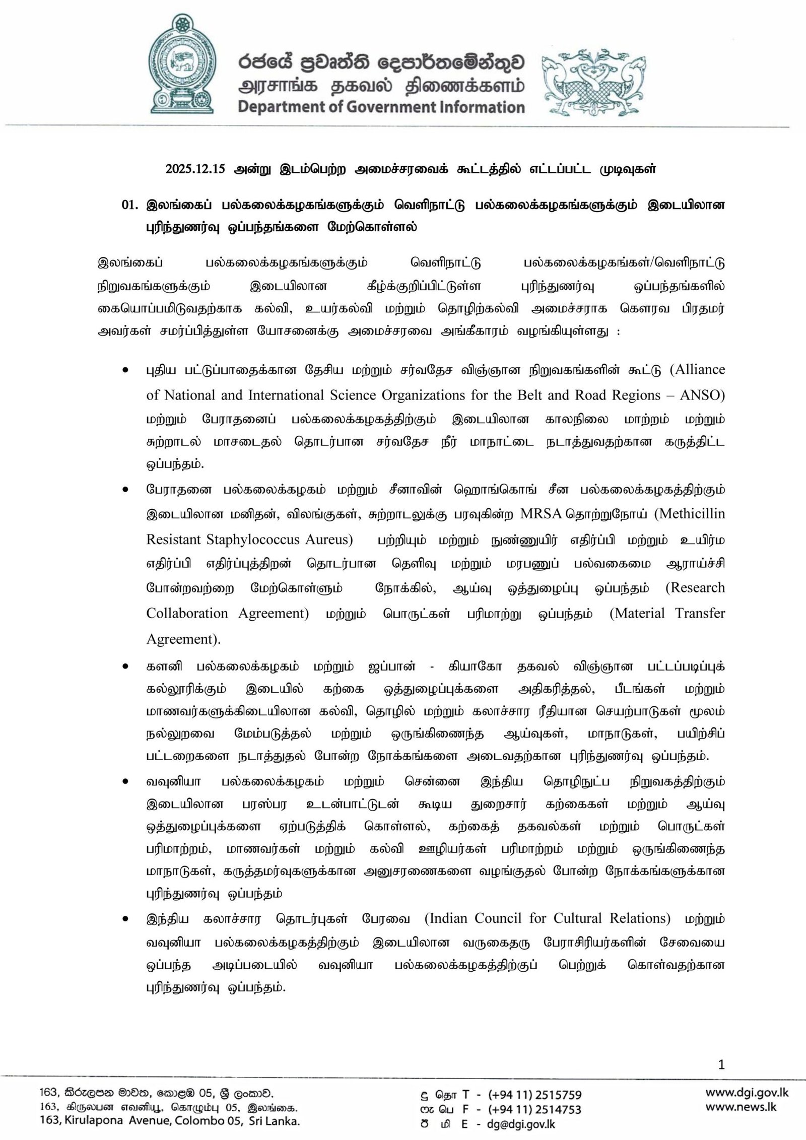 இலங்கைப் பல்கலைக்கழகங்களுக்கும் வெளிநாட்டுப் பல்கலைக்கழகங்களுக்கும் இடையிலான புரிந்துணர்வு ஒப்பந்தங்களில் கையொப்பமிடுவதற்கு கல்வி, உயர் கல்வி, தொழில்கல்வி அமைச்சராக பிரதமர் சமர்ப்பித்த யோசனைக்கு அமைச்சரவை அங்கீகாரம் வழங்கியுள்ளது