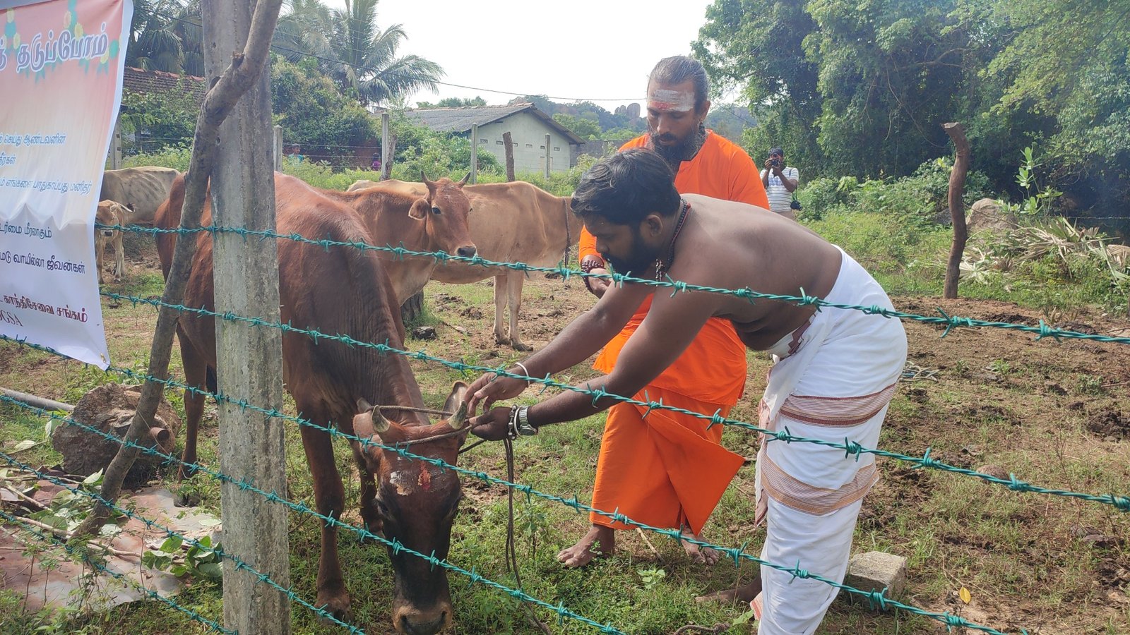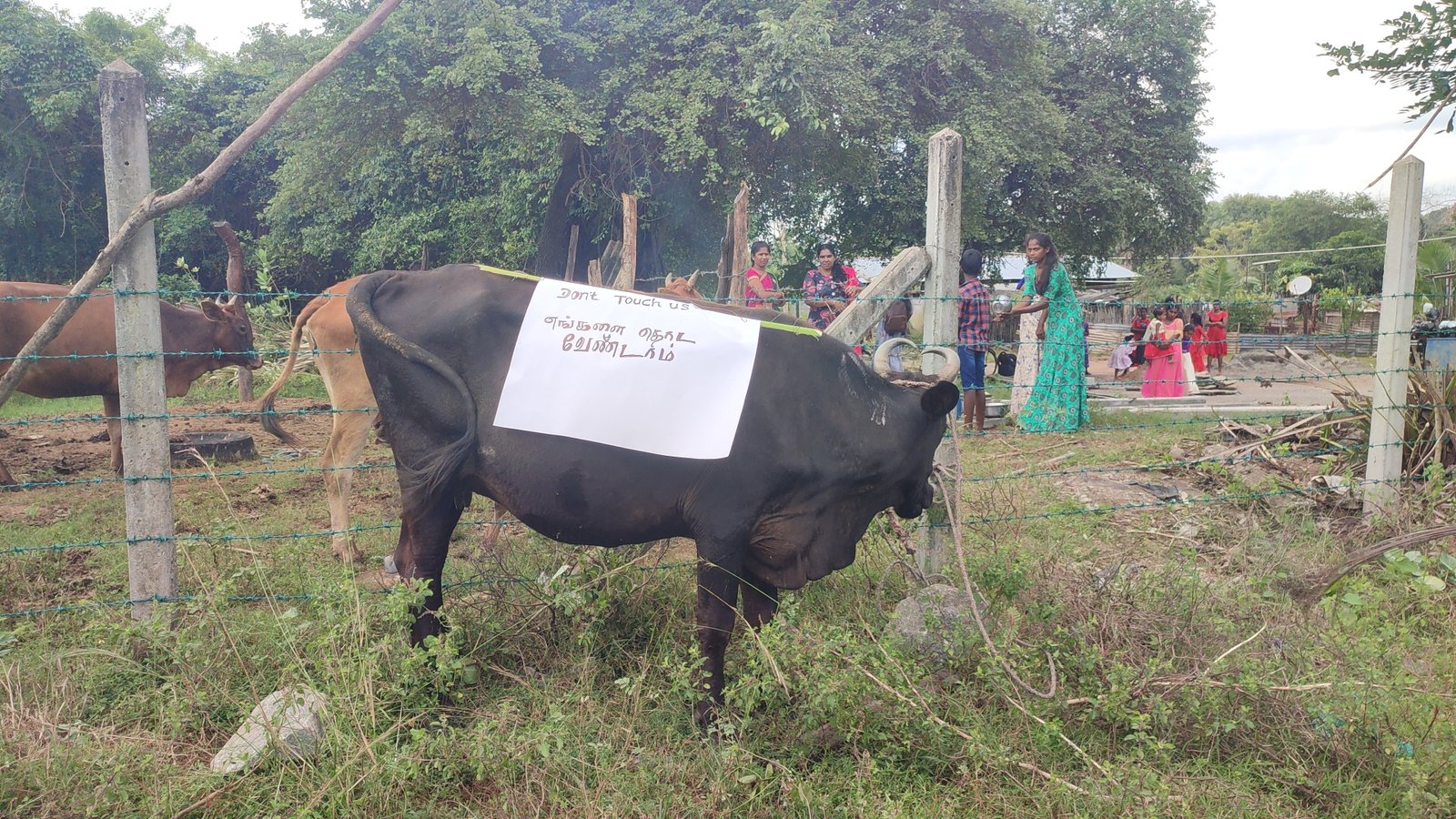 இதன் போது மிருக வதையை தடுப்போம், ஆக்களில் அரசியல் செய்து ஆண்டவனின் ஆசிர்வாதத்தை இழக்காதீர்கள், உங்களுக்கு உணவளிக்கும் எங்களை பாதுகாப்பது மனிதர் உங்களது கடமையாகும், எங்களது உணவை மறுப்பது உரிமை மீறலாகும் என்ற வாசகங்கள் எழுதப்பட்ட பதாதை பட்டிக்கு அருகில் தொங்கவிடப்பட்டிருந்தது.