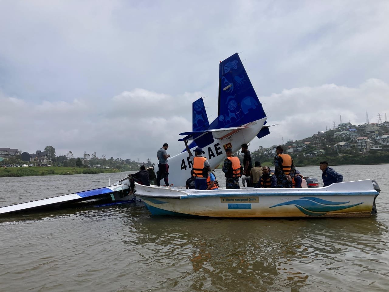 விமானத்தில் இருந்த இரண்டு விமானிகளையும், ஏரியில் படகு சவாரி செய்துகொண்டிருந்தவர்கள் மீட்டுள்ளனர்.