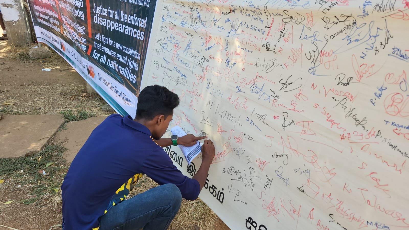அனைத்து தேசிய இனங்களுக்கும் சம உரிமைகளை உறுதி செய்யும் அரசியலமைப்பிற்காகப் போராடுவோம் என்ற கோரிக்கையை வலியுறுத்தி சம உரிமை இயக்கம் கிளிநொச்சி நகரில் கையெழுத்து சேகரிக்கும் பணியை முன்னெடுத்திருந்தது