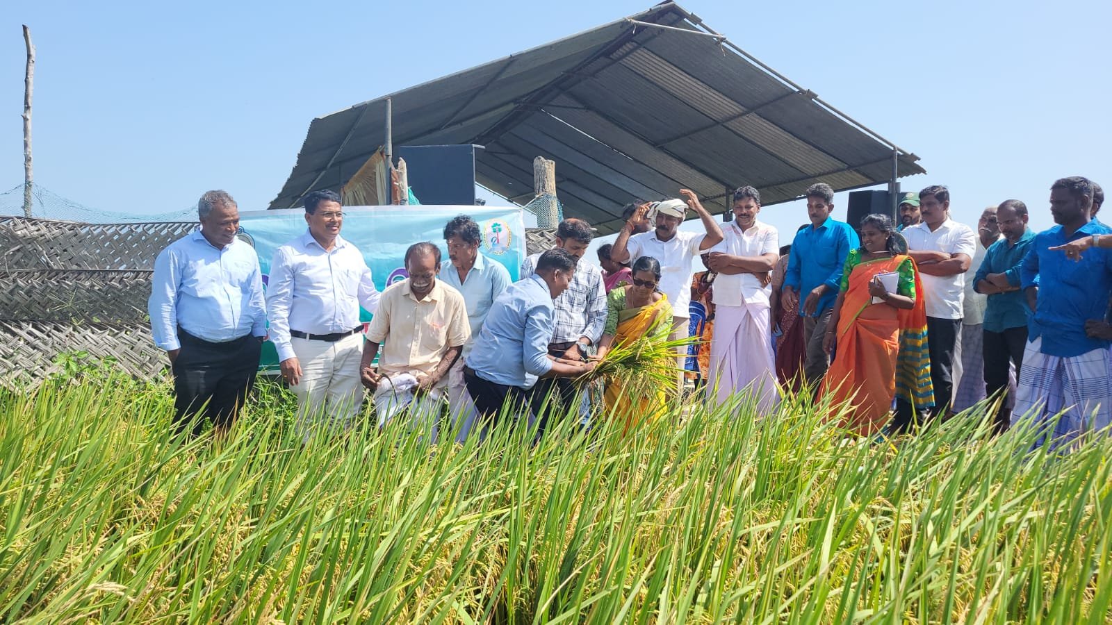 விவசாயிகள் மத்தியில் நவீன விவசாய தொழில்நுட்பங்களை வழங்கி நெல் உற்பத்தியை அதிகரிக்கும் நோக்கில் காலநிலைக்கு சீரமைவான விவசாயத்திட்டத்தின் தொழில்நுட்ப உதவியுடன் மாவட்ட விவசாயத்திணைக்களத்தின் ஆலோசணைக்கு அமைய நாற்று நடும் இயந்திரம் மூலம் AT362நெல் வர்க்கம் நெற்ச்செய்கை மேற்கொள்ளப்பட்ட வயலில் நெல் அறுவடை விழா கிளிநொச்சி கோணாவில் பகுதியில் இன்று காலை 9.00மணிக்கு நடைபெற்றது.