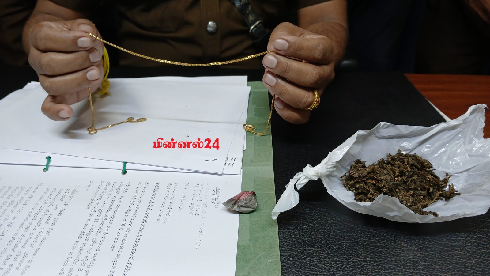 கைது செய்யப்பட்ட சந்தேகங்க நபர்களிடமிருந்து அபகரிக்கப்பட்ட தங்கச் சங்கிலி மற்றும் அவர்களின் உடமையில் இருந்து 2.25 மில்லிகிராம் கெராயினும் 20 கிராம் கேரளா கஞ்சாவும் திருட்டில் ஈடுபடுவதற்காக பயன்படுத்திய மோட்டார் சைக்கிளையும் பொலிசார் பறிமுதல் செய்துள்ளனர்.
