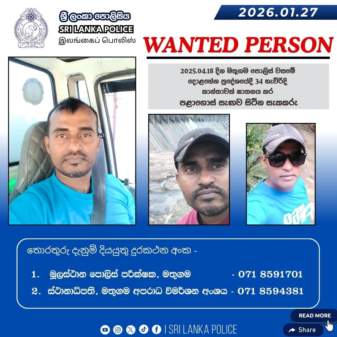 டெலந்தஹேன பகுதியில், கடந்த வருடம் ஏப்ரல் 18 ஆம் திகதி, 34 வயதுடைய பெண் ஒருவர் கொலை செய்யப்பட்ட சம்பவம் தொடர்பாக தேடப்படும் சந்தேக நபரை கண்டுபிடிப்பதற்காக, மத்துகம பொலிஸார் பொதுமக்களின் உதவியை நாடியுள்ளனர்.