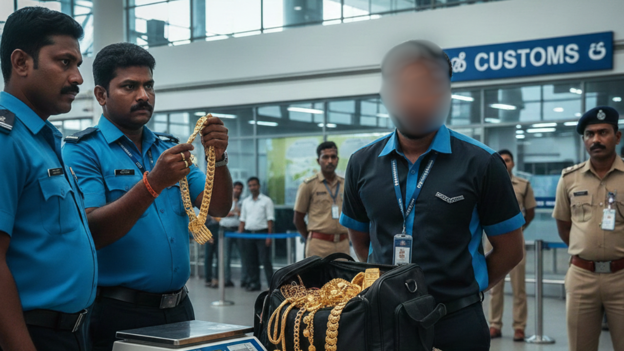 கைது செய்யப்பட்ட நபர், தங்கம் மற்றும் தங்க பாலங்களை தனது பயணப் பையில் மறைத்து வைத்து, விமான நிறுவன பணியாளர்களுக்காக ஒதுக்கப்பட்ட பிரத்தியேக வெளியேறும் வாயில் வழியாக வெளியேற முயன்றுள்ளார்.