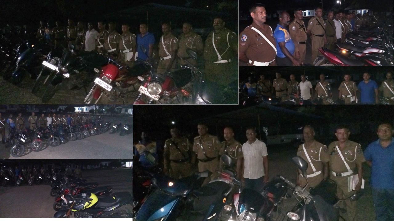 இதன் போது மோட்டார் சைக்கிள் ஆவணம் காப்புறுதி எதுவும் இன்றி மோட்டார் சைக்கிளை செலுத்துவது, சாரதி அனுமதிப்பத்திரமின்றி வாகனம் செலுத்துவது தலைக்கவசம் அணியாது செல்வது , ஒரு மோட்டார் சைக்கிளில் இருவருக்கு மேற்பட்டவர்கள் பயணிப்பது , அதிவேகமாக செல்வது , மிக ஒலி எழுப்பிய மோட்டார் சைக்கிள்கள் தொடர்பில் தலைக்கவசம் இன்றியும் சாரதி அனுமதிப்பத்திரம் உள்ளிட்ட முக்கிய ஆவணங்கள் இன்றி பயணித்தமை உள்ளிட்ட பொது போக்குவரத்து சட்ட திட்டங்களை மீறிய குற்றச்சாட்டின் அடிப்படையில் 20க்கும் மேற்பட்ட மோட்டார் சைக்கிள்கள் உட்பட அதனை ஓட்டிய சந்தேக நபர்கள் சட்டநடவடிக்கைக்கு உட்படுத்தப்பட்டனர்.