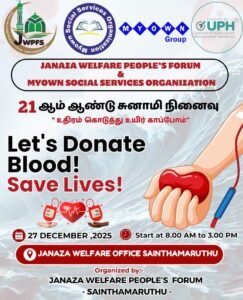 சாய்ந்தமருது ஜனாஸா நலன்புரி மக்கள் பேரவையின் ஏற்பாட்டில் “சுனாமி” 21 ஆண்டு நிறைவை ஒட்டி மையோன் சமூக சேவை அமைப்பு, மையோன் குரூப், மற்றும் யுனைடெட் பவர் ஹவுஸ் ஆகியவற்றின் அனுசரணையில் இணைந்து மாபெரும் இரத்ததான முகாம் ஒன்றை எதிர்வரும் டிசம்பர் 27 சனிக்கிழமை காலை 8.00 மணி தொடக்கம் பிற்பகல் 3.00 மணி வரை சாய்ந்தமருது ஜனாஸா நலன்புரி மக்கள் பேரவை தலைமைக் காரியாலயத்தில் இடம்பெற உள்ளது.