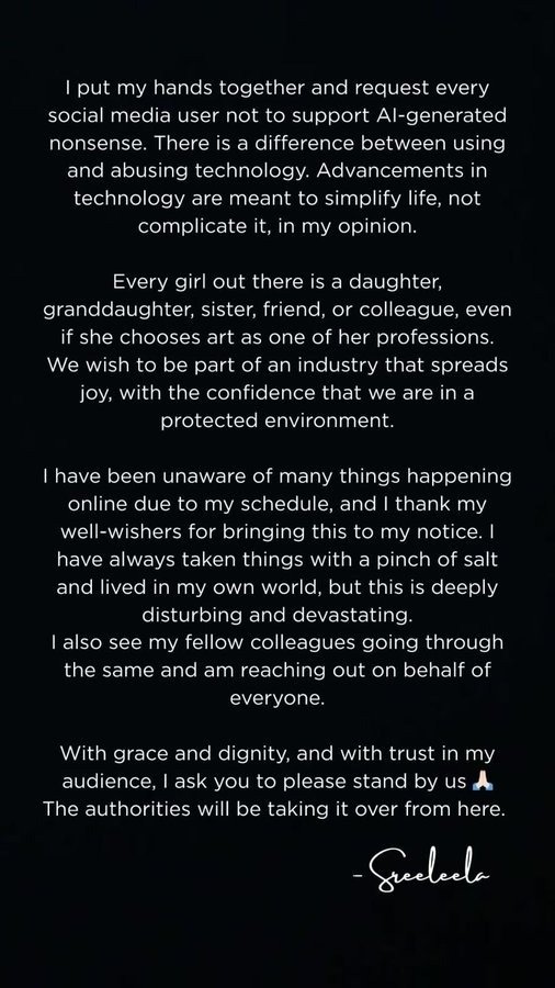 செயற்கை நுண்ணறிவு (AI) தொழில்நுட்பம் தவறான முறையில் பயன்படுத்தப்படுவது குறித்து நடிகை ஸ்ரீலீலா தனது ஆழ்ந்த வேதனையைத் தெரிவித்துள்ளார்.