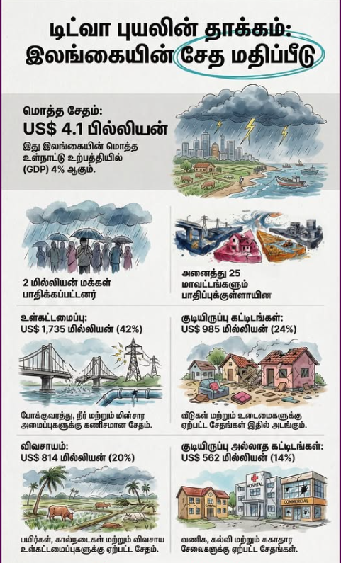 உலக வங்கியின் தர அறிக்கையின்படி, டிட்வா புயலால் இலங்கைக்கு ஏற்பட்ட மொத்த சேதம் அமெரிக்க டொலர் 4.1 பில்லியன் ஆகும்.