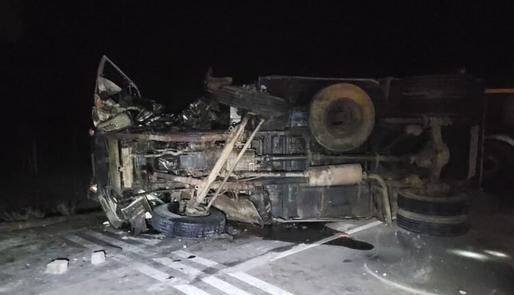 உழவு இயந்திரத்துடன் மோதிய டிப்பர் வீதியில் குறுக்காக தடம் புரண்டது.