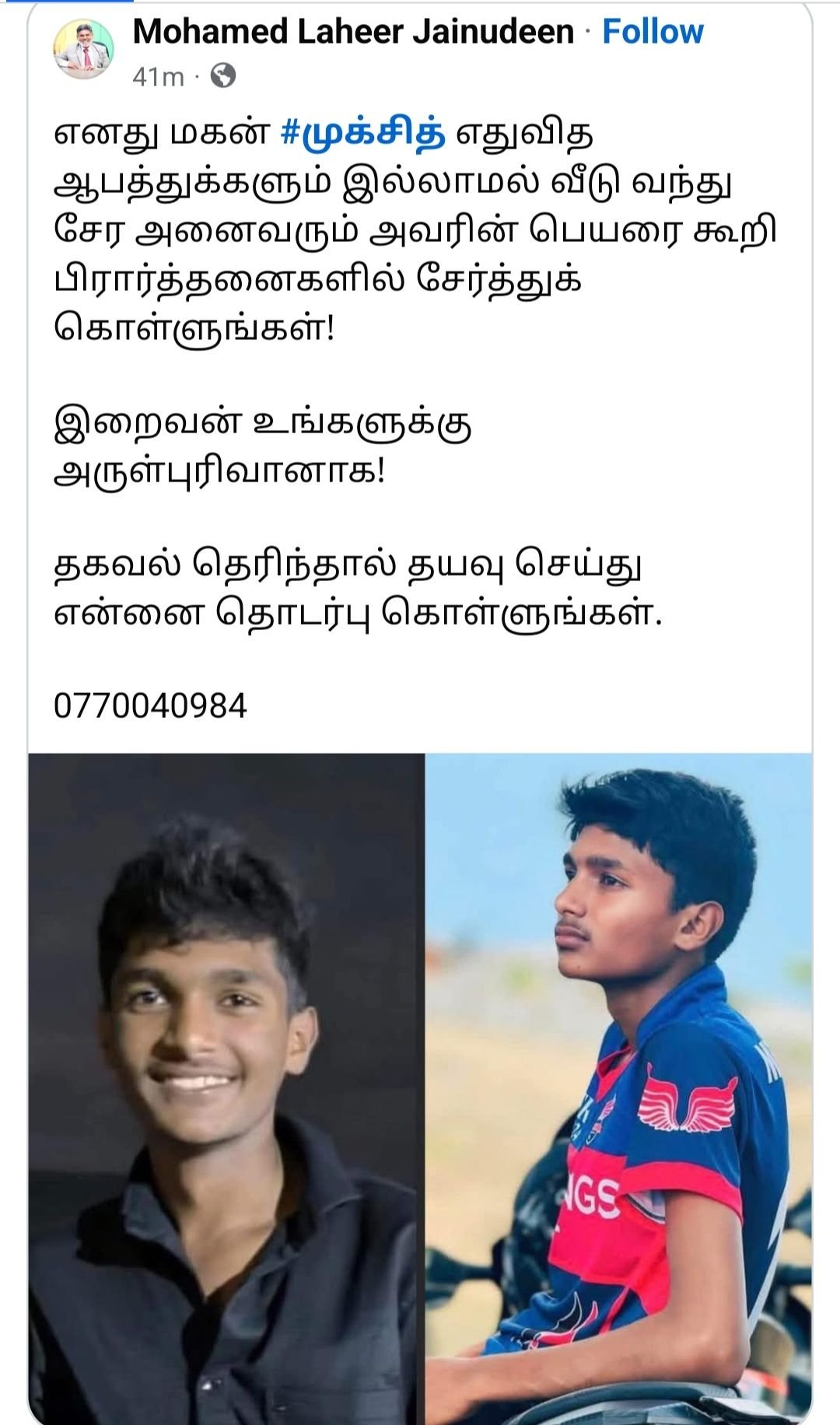 மாணவன் குறித்து யாருக்காவது தகவல் தெரிந்து இருப்பின், திருகோணமலை பொலிஸ் நிலையத்திற்கு உடனடியாக அறிவிக்குமாறு பொலிஸார் பொதுமக்களிடம் கேட்டுக்கொண்டுள்ளனர்.