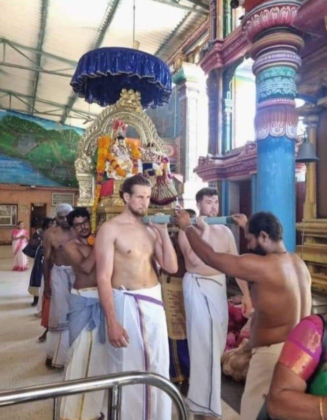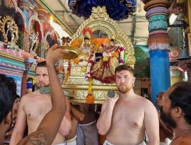 திருகோணமலை திருக்கோணேஸ்வரம் அருள் மிகு மாதுமை அம்பாள் உடனுறை கோணேஸ்வரப் பெருமானின் வருடாந்த மகோற்சவத்தின் போது சுற்றுலா பயணிகள் இருவர் இந்து மத கலாச்சார உடையுடன் வருகை தந்து பக்தியுடன் சுவாமி தூக்கியுள்ளனர்.