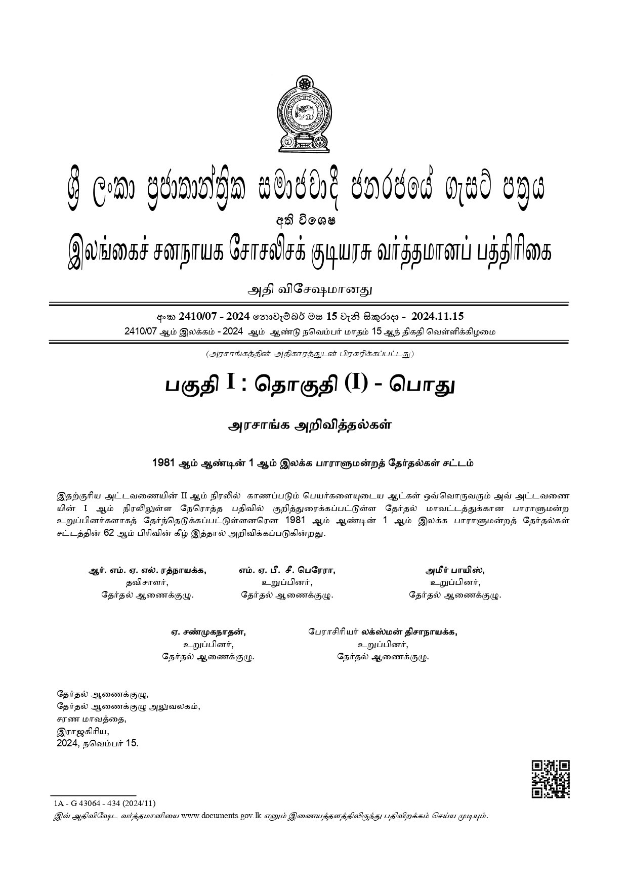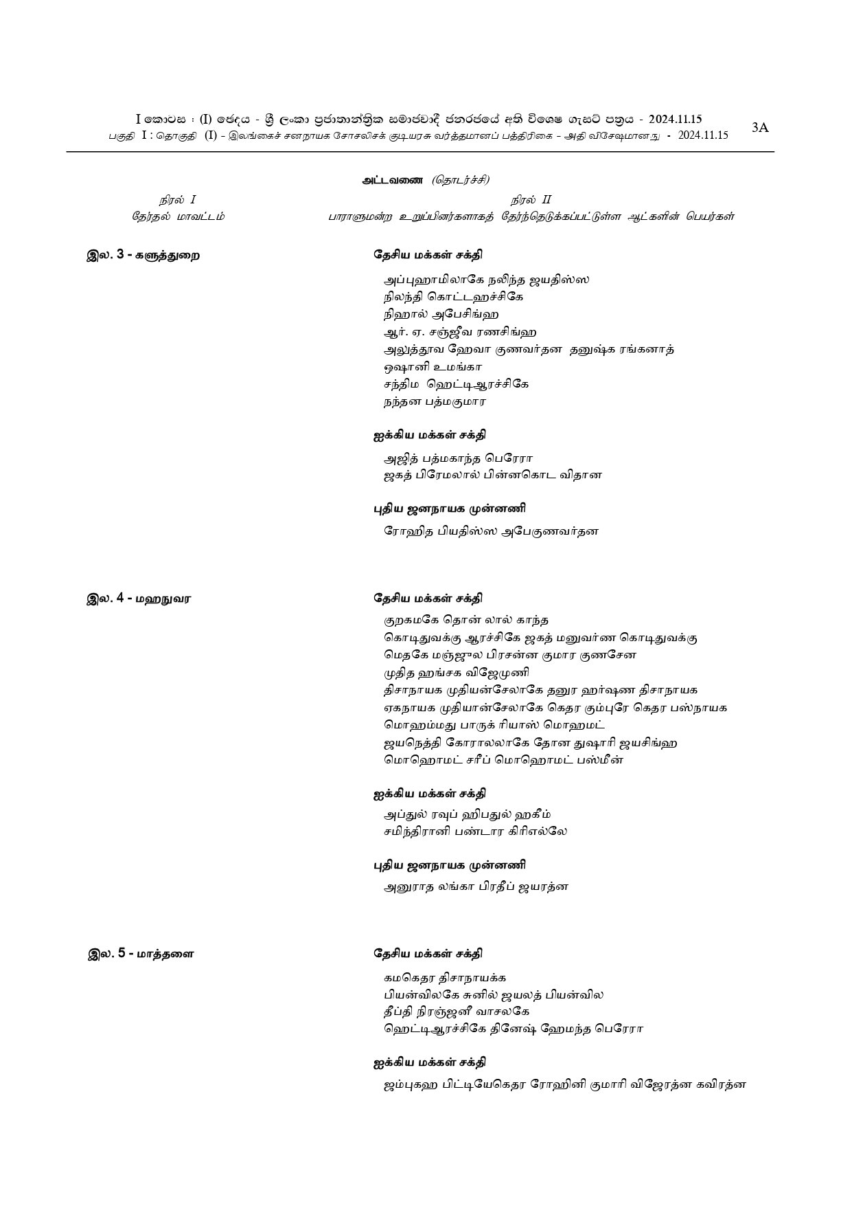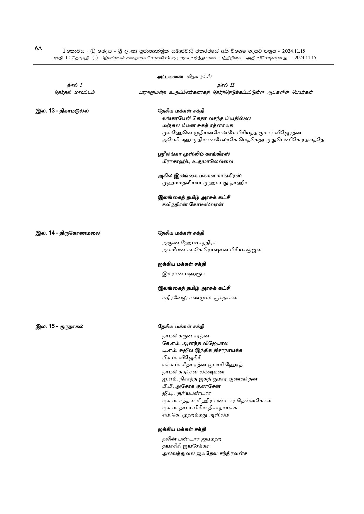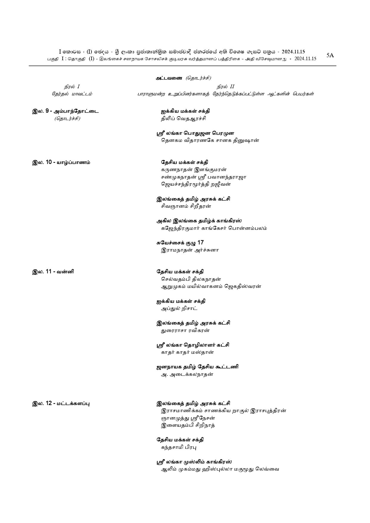 நாடாளுமன்ற உறுப்பினர்களாக தெரிவுசெய்யப்பட்டுள்ளவர்களின் பெயர்கள் அடங்கிய வர்த்தமானி!