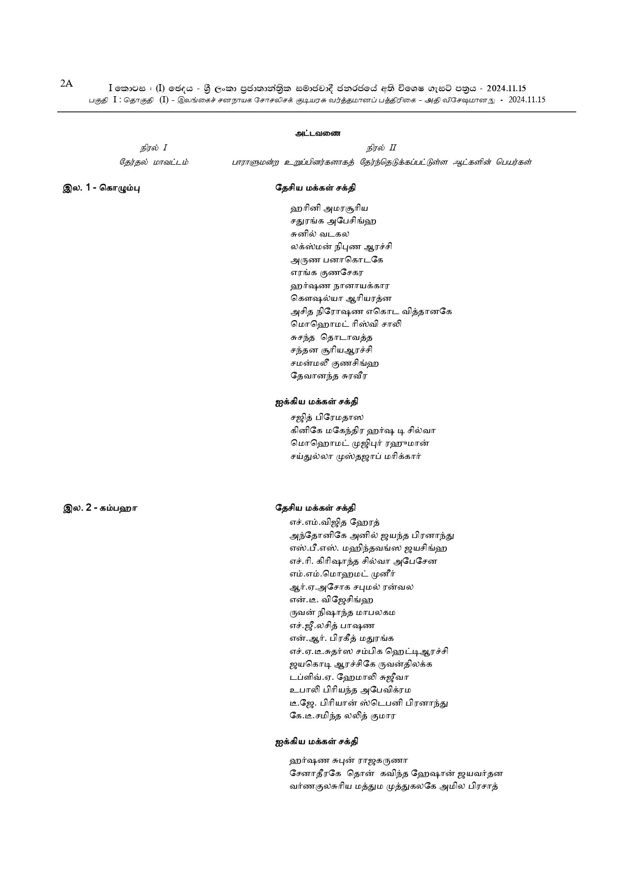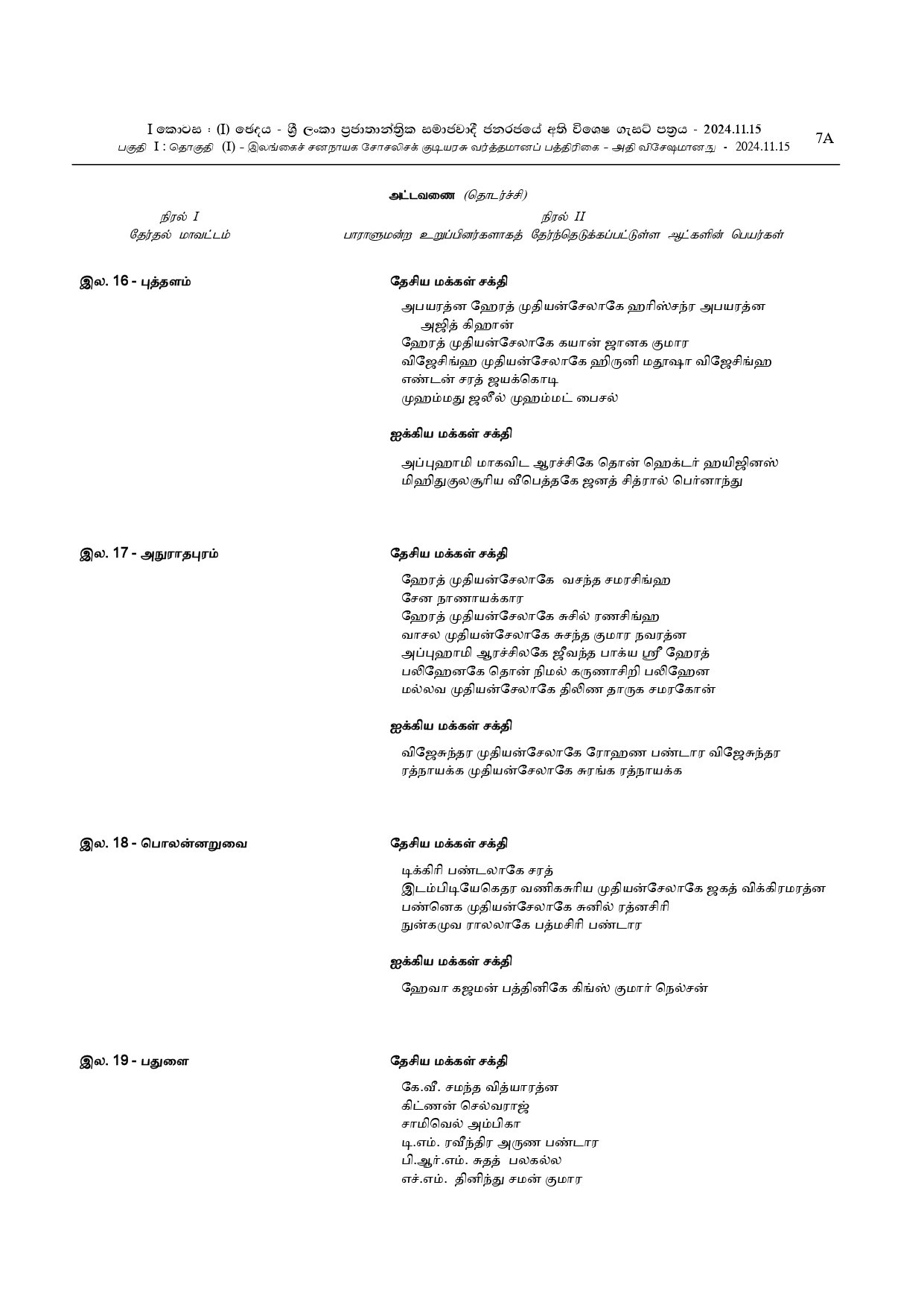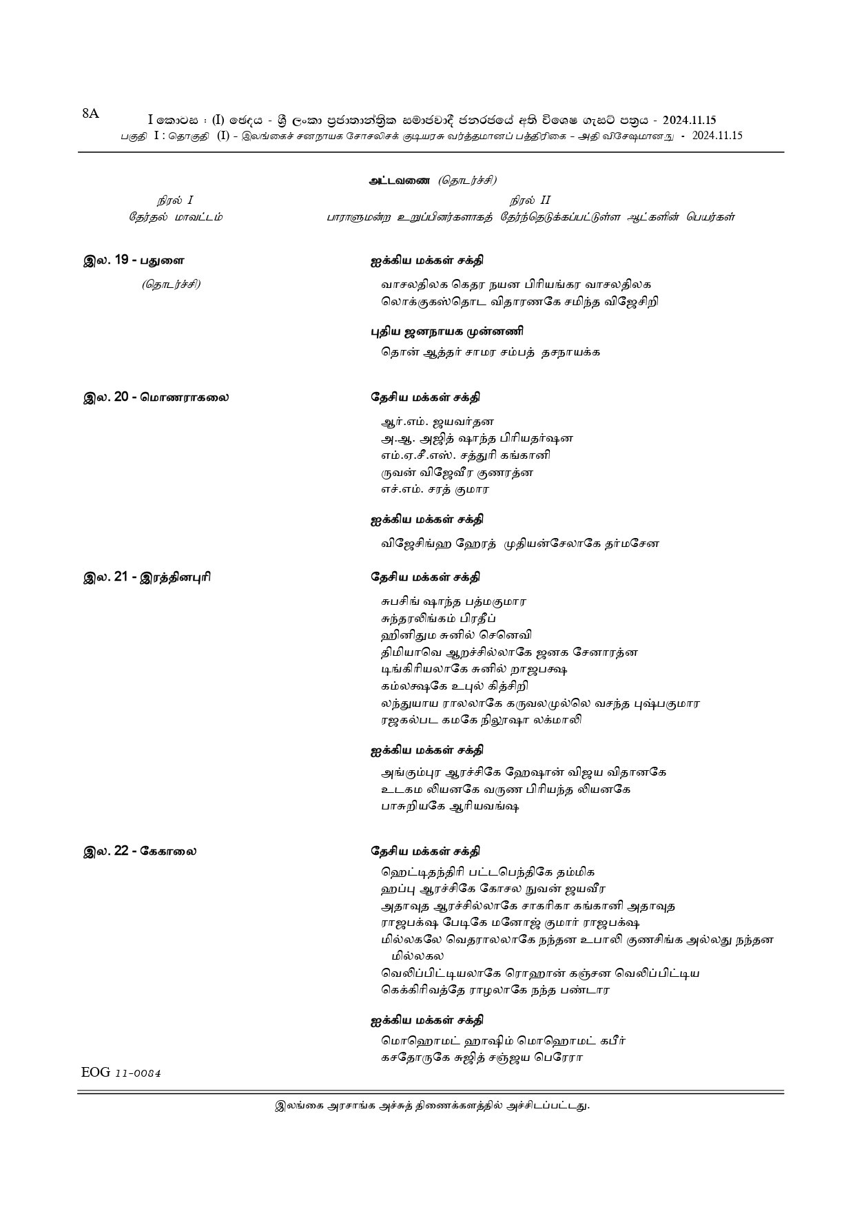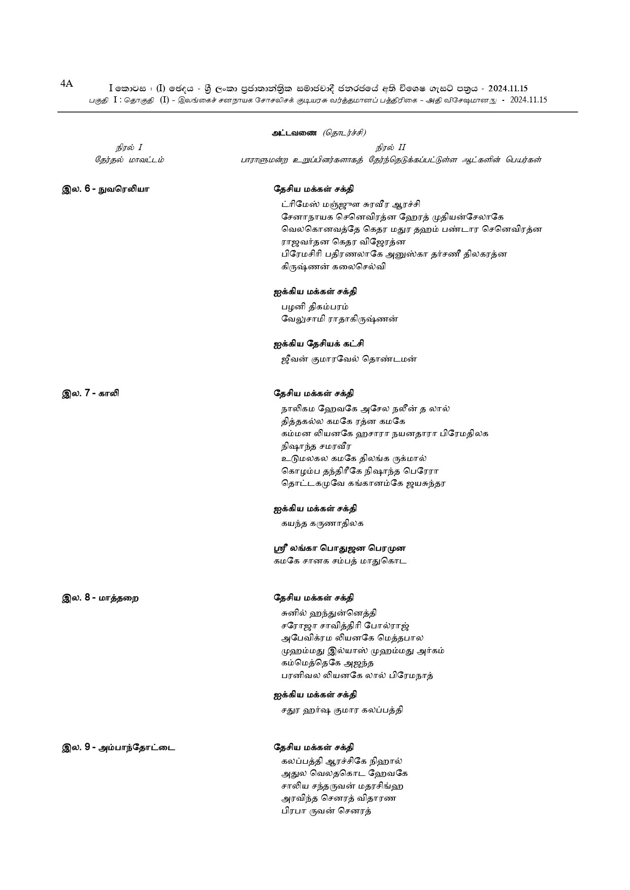 அதன் பின்னர் 29 தேசிய பட்டியல் நாடாளுமன்ற உறுப்பினர்களின் பெயர்கள் அடங்கிய வர்த்தமானி, தேர்தல்கள் ஆணைக்குழுவினால் வெளியிடப்படும்.