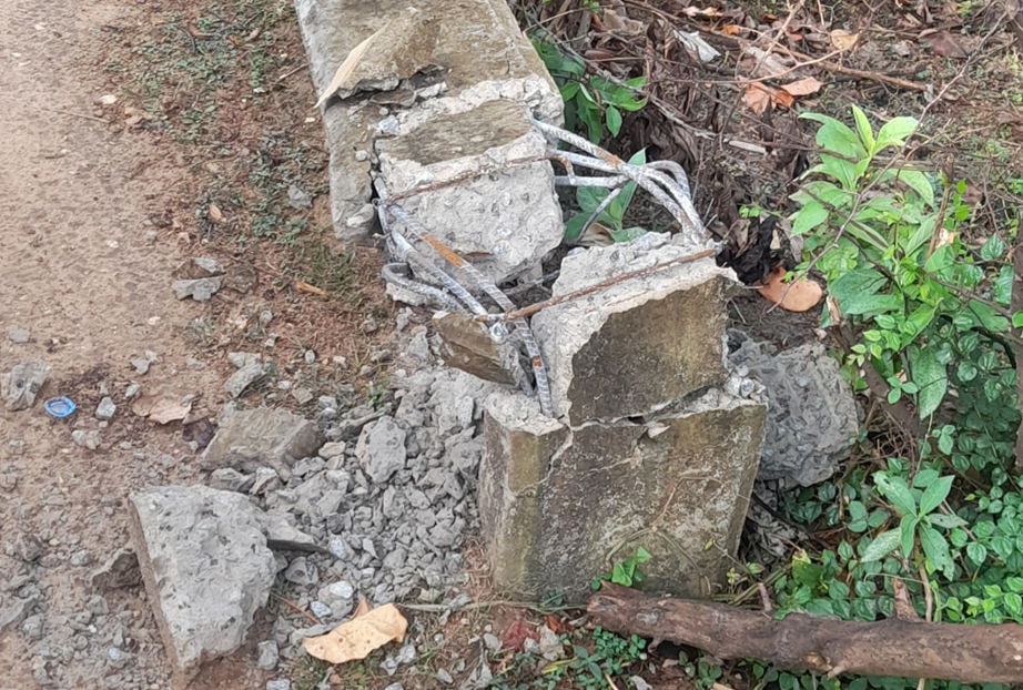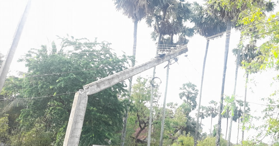 பலத்த காற்றினால் முறிந்து விழுந்த மின்கம்பம் : மின்சாரம் தடை