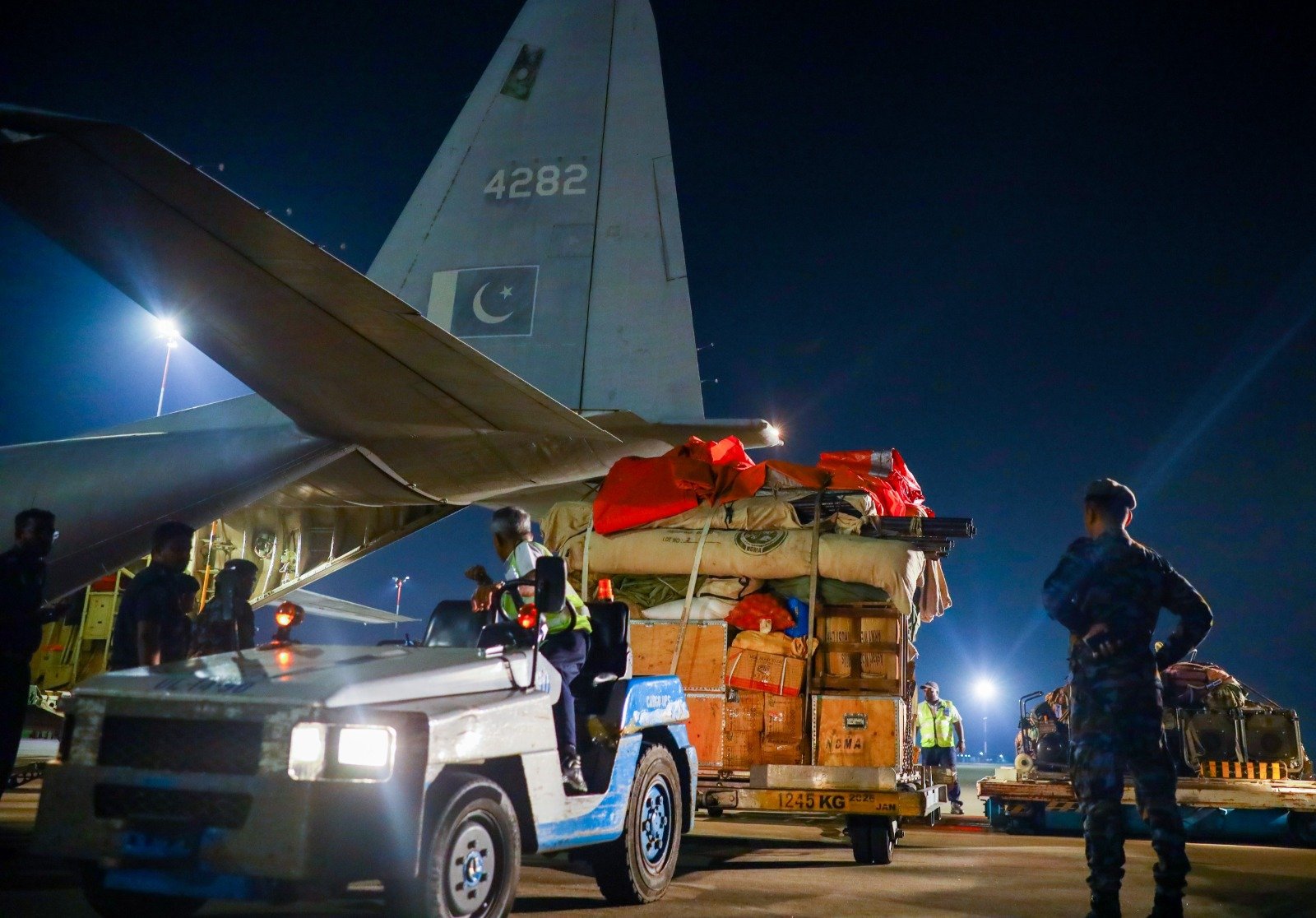 அவசர நிவாரணப் பொருட்கள் மற்றும் விசேட மீட்புக் குழுவுடனான பாகிஸ்தான் விமானப்படையின் C-130 விமானம் நேற்று புதன்கிழமை பிற்பகல் நாட்டை வந்தடைந்தது.
