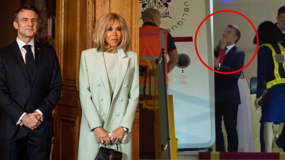 விமானத்தின் கதவு திறக்கப்பட்டபோது மேக்ரான் இறங்குவதற்கு முன், அவரது முகத்தை நோக்கி மனைவி பிரிஜிட் இரண்டு கைகள் நீட்டி தாக்குவதுபோல் பாவனை செய்தது கேமராவில் பதிவானது.