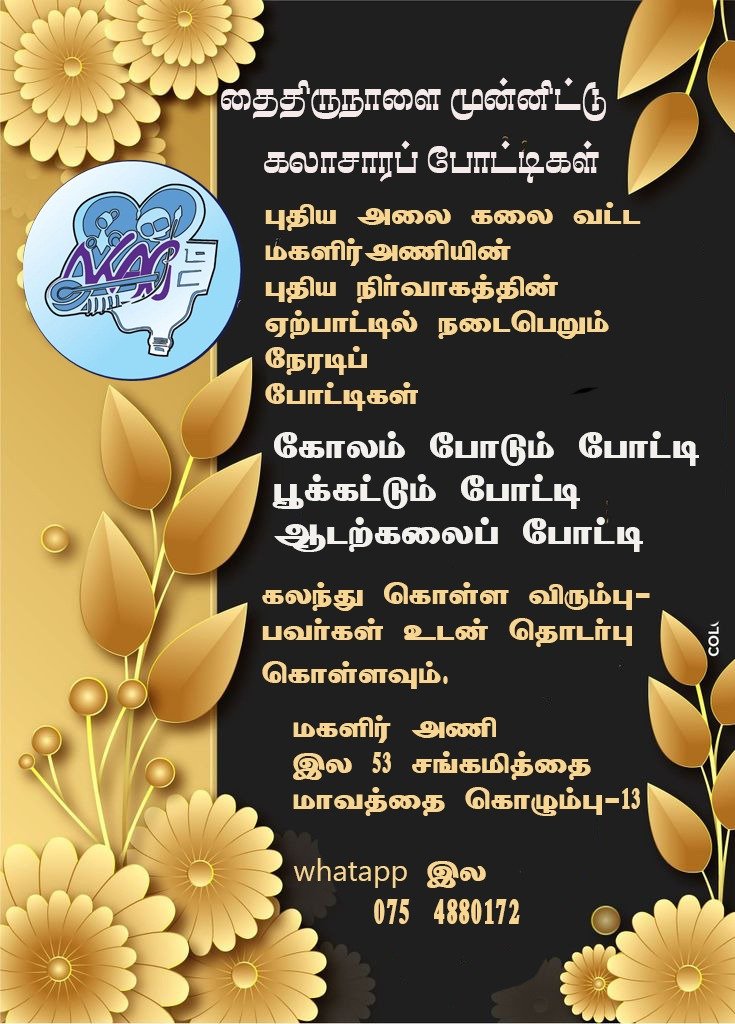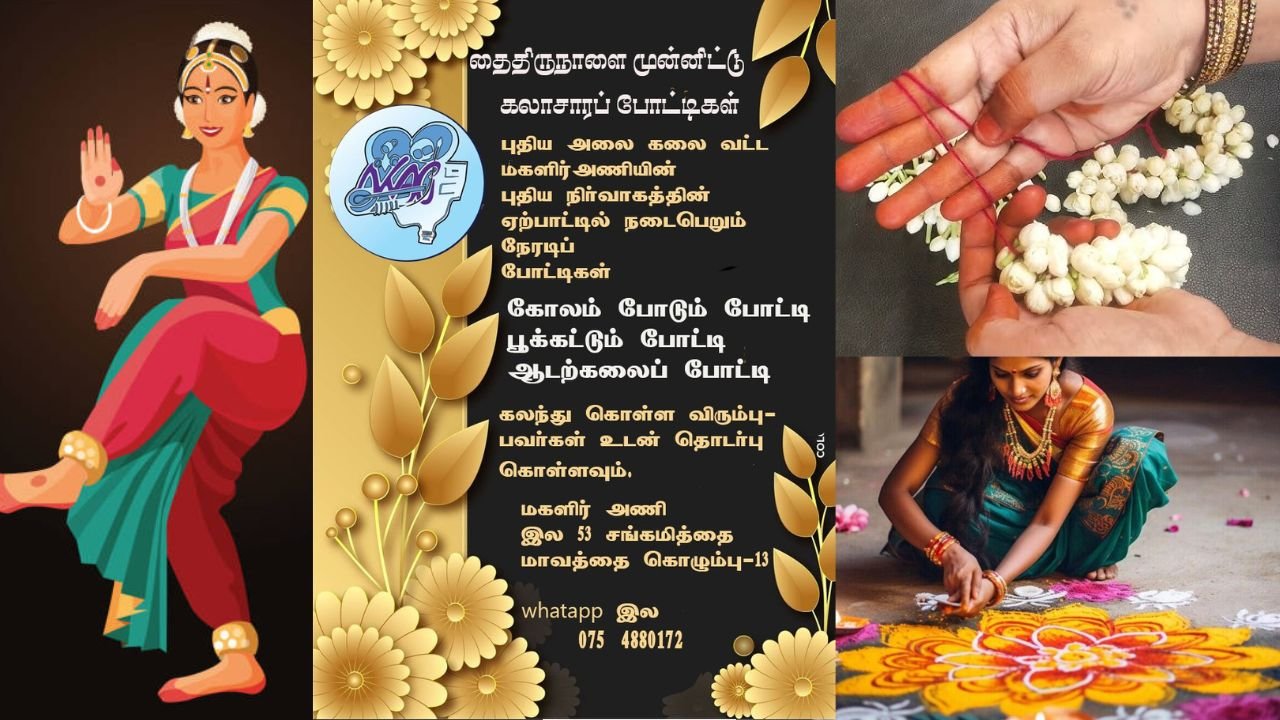 கடந்த 44 ஆண்டுகளாக தலைநகரில் இயங்கி வரும் புதிய அலை கலை வட்டம் அதனது மகளிர் அணி மூலமாக தைத்திருநாளை முன்னிட்டு கலாச்சாரப் போட்டிகளை நடத்தவுள்ளது.