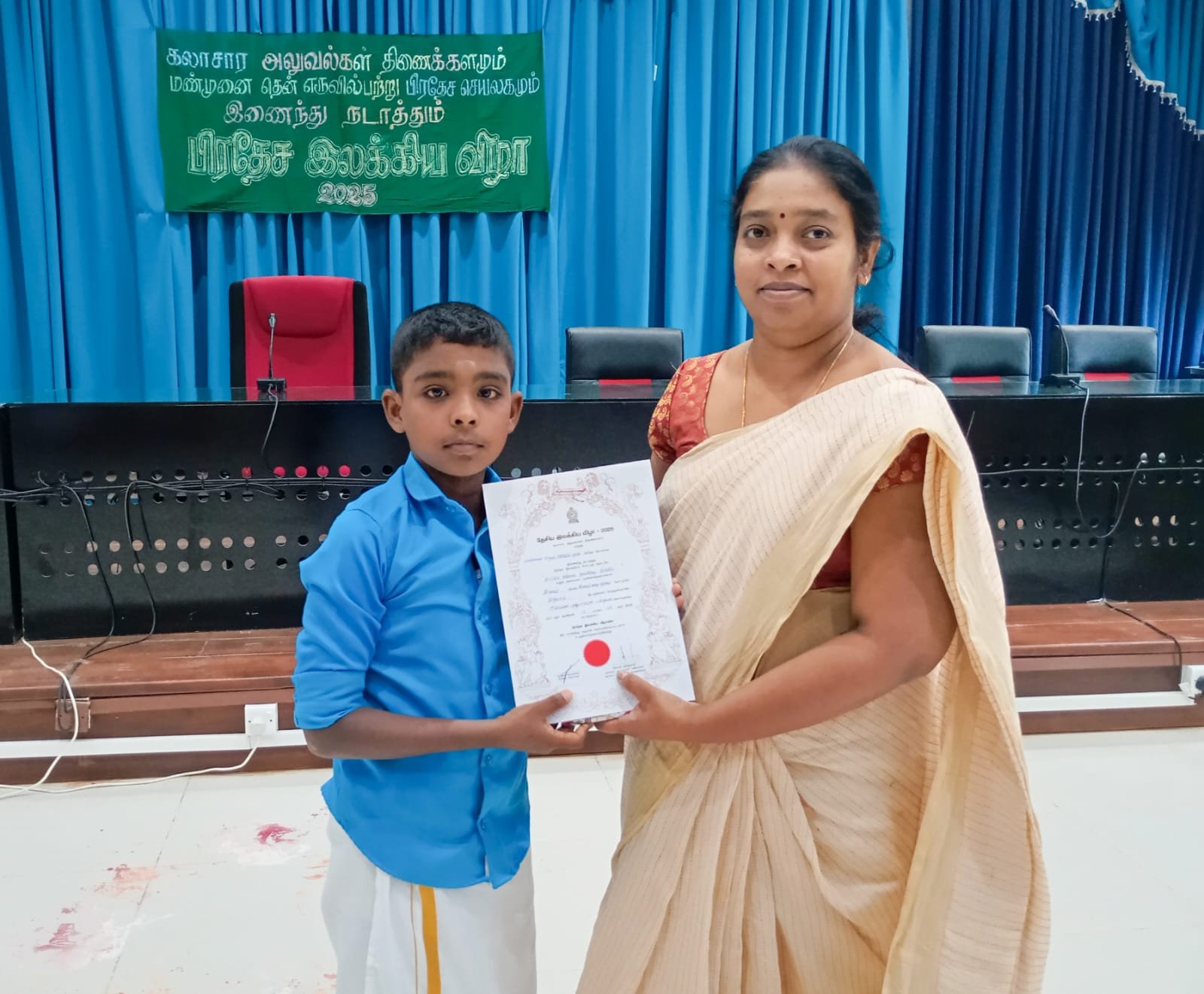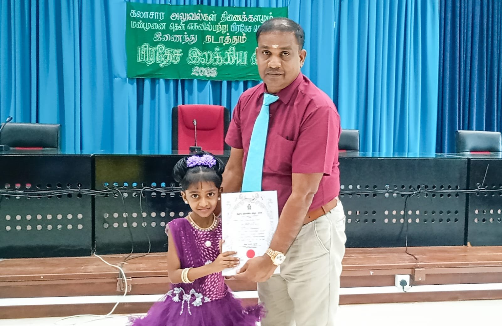 இதன் போது 2024ம் ஆண்டு இலக்கிய போட்டியில் தேசிய ரீதியில் நாட்டார் பாடல் போட்டியில் 1ம் இடத்தினை பெற்று வெற்றி பெற்ற மாணவன் செல்வன் வி. டிஹாணன் பாராட்டி கௌரவம் வழங்கப்பட்டமை சிறப்பம்சமாகும்.