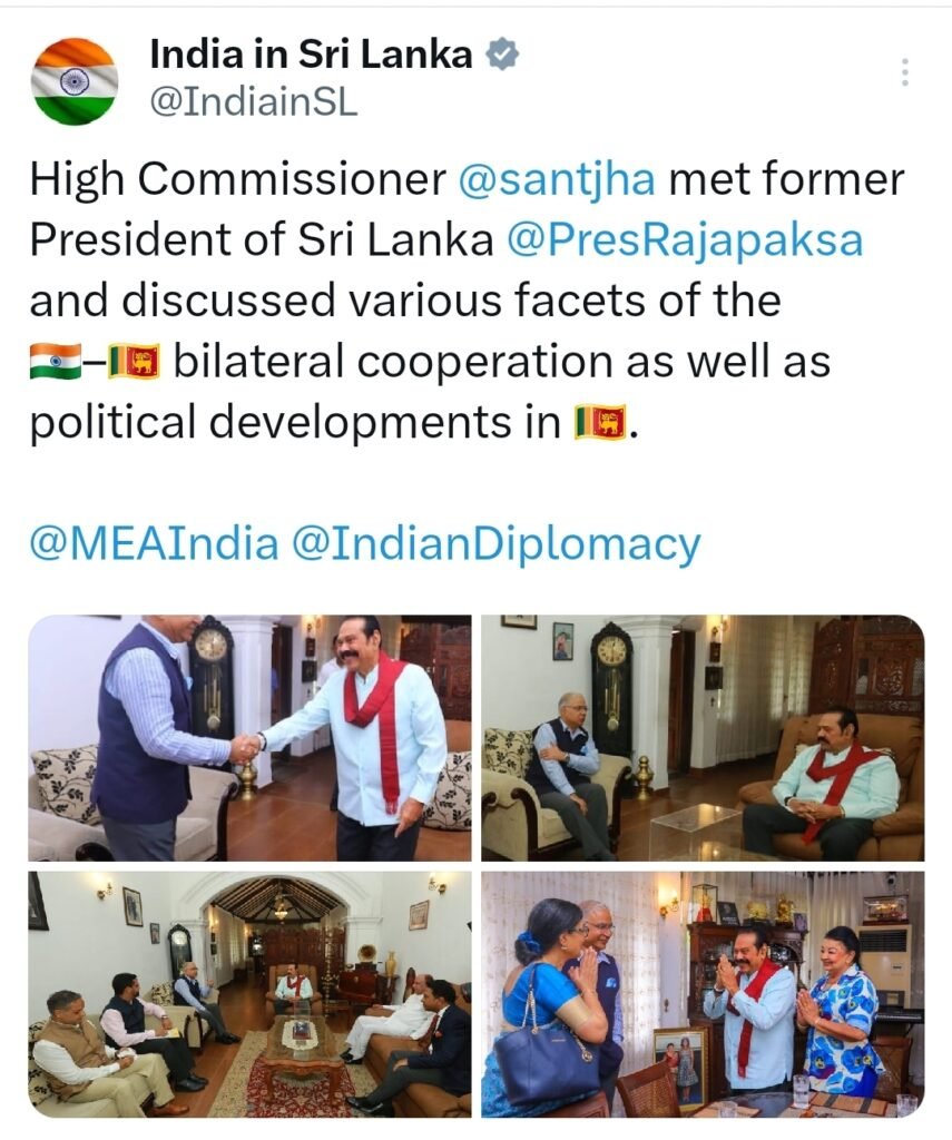 இலங்கைக்கான இந்திய உயர் ஸ்தானிகர் சந்தோஷ் ஜா, முன்னாள் ஜனாதிபதி மஹிந்த ராஜபக்ஷவை இன்று தங்காலையில் உள்ள அவரது தனிப்பட்ட இல்லத்தில் சந்தித்துள்ளார்.