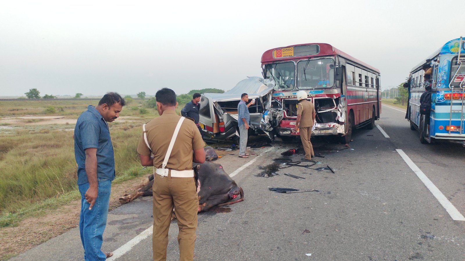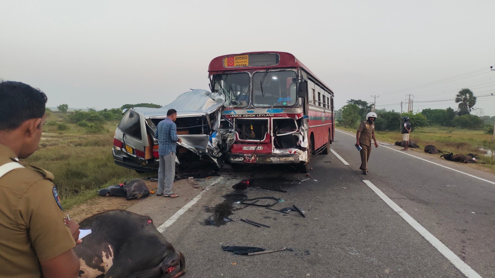 குறித்த பேருந்து வீதியில் பயணித்த மாடுகளுடன் மோதிய பின் வானுடன் மோதி குறித்த விபத்து இடம்பெற்றுள்ளது.