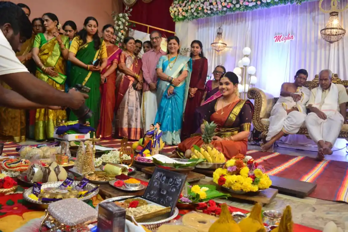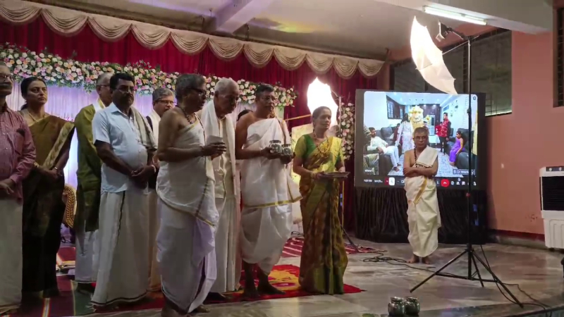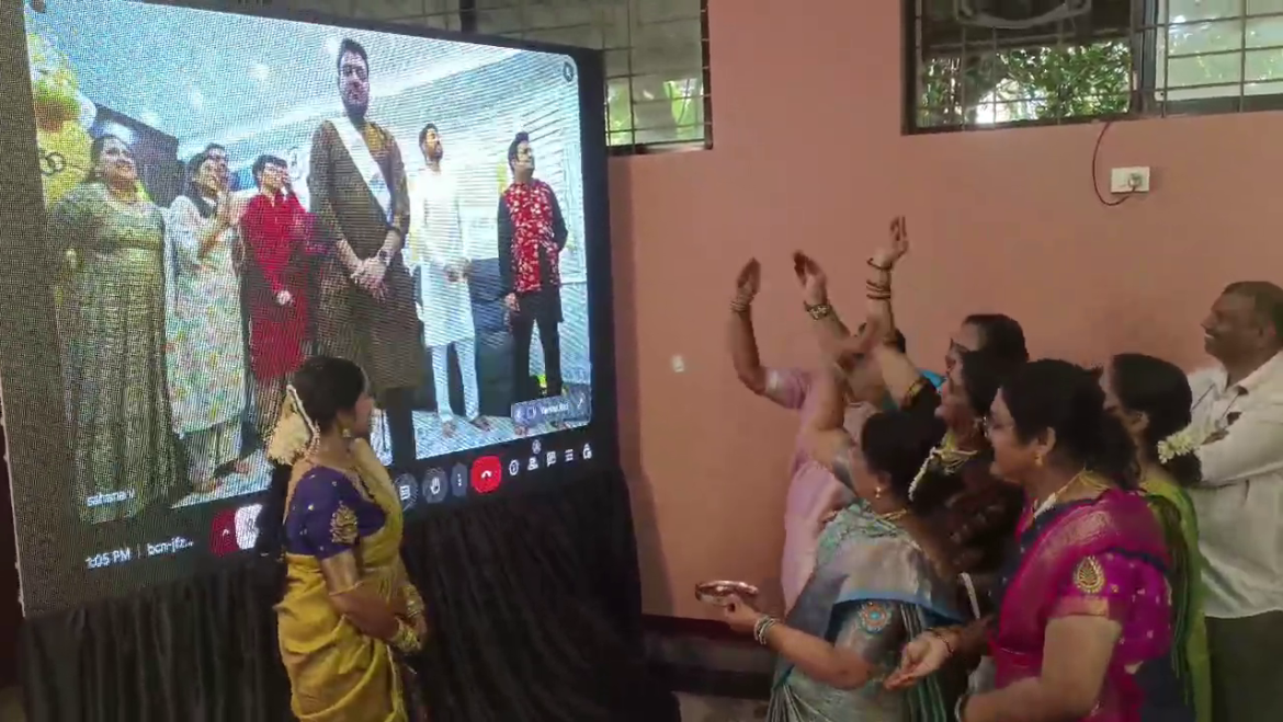மணமகள் மேடையில் அமர்ந்திருக்க, திரையில் தோன்றிய மணமகனுடன் பிராமண சம்பிரதாய முறைப்படி நிச்சயதார்த்தம் இனிதே நடைபெற்றது.