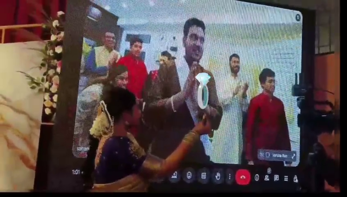மணமகள் மேடையில் அமர்ந்திருக்க, திரையில் தோன்றிய மணமகனுடன் பிராமண சம்பிரதாய முறைப்படி நிச்சயதார்த்தம் இனிதே நடைபெற்றது.