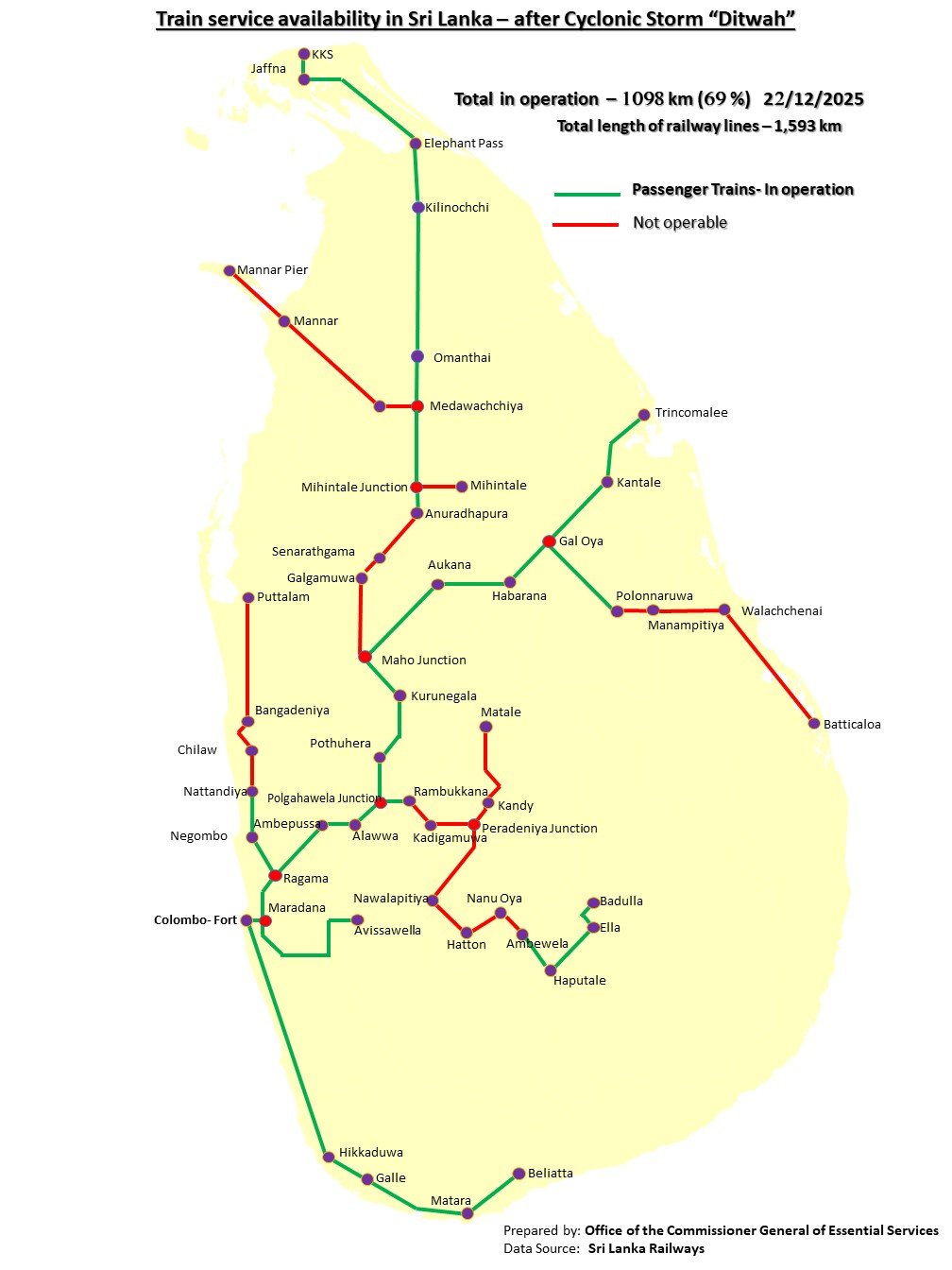 ‘டிட்வா’ சூறாவளியின் பாதிப்புகளுக்குப் பின்னர், இலங்கையின் ரயில் வலையமைப்பில் சுமார் 70 சதவீத சேவைகள் தற்போது மீள ஆரம்பிக்கப்பட்டுள்ளதாக உத்தியோகபூர்வ தரவுகள் தெரிவிக்கின்றன.