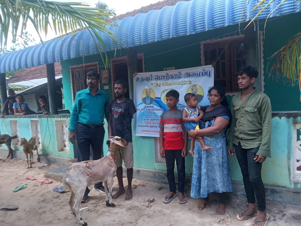 இதனால் இந்தக் குடும்பத்தின் வாழ்வாதாரம் முற்றிலும் பதிக்கப்பட்டுள்ளது. இதனை கருத்தில் கொண்டு அவர்களது வாழ்வாதாரத்தை மேம்படுத்தும் நோக்கில் கனடாவில் வசித்துவருபவரும் உதவும் பொற்கரம் அமைப்பின் ஸ்தாபகருமான சமூக சேவையாளர் விசுவலிங்கம் கணபதிப்பிள்ளையின் வேண்டுகோளுக்கு இணங்க கனடாவில் ‘உதயன்’ பத்திரிகையின் அதிபரும் பிரதம ஆசிரியருமான லோகேந்திரலிங்கத்தின்ன் நிதி அன்பளிப்பில் 3 ஆடுகள் பாதிக்கப்பட்ட குடும்பத்திற்கு வழங்கப்பெற்றது.