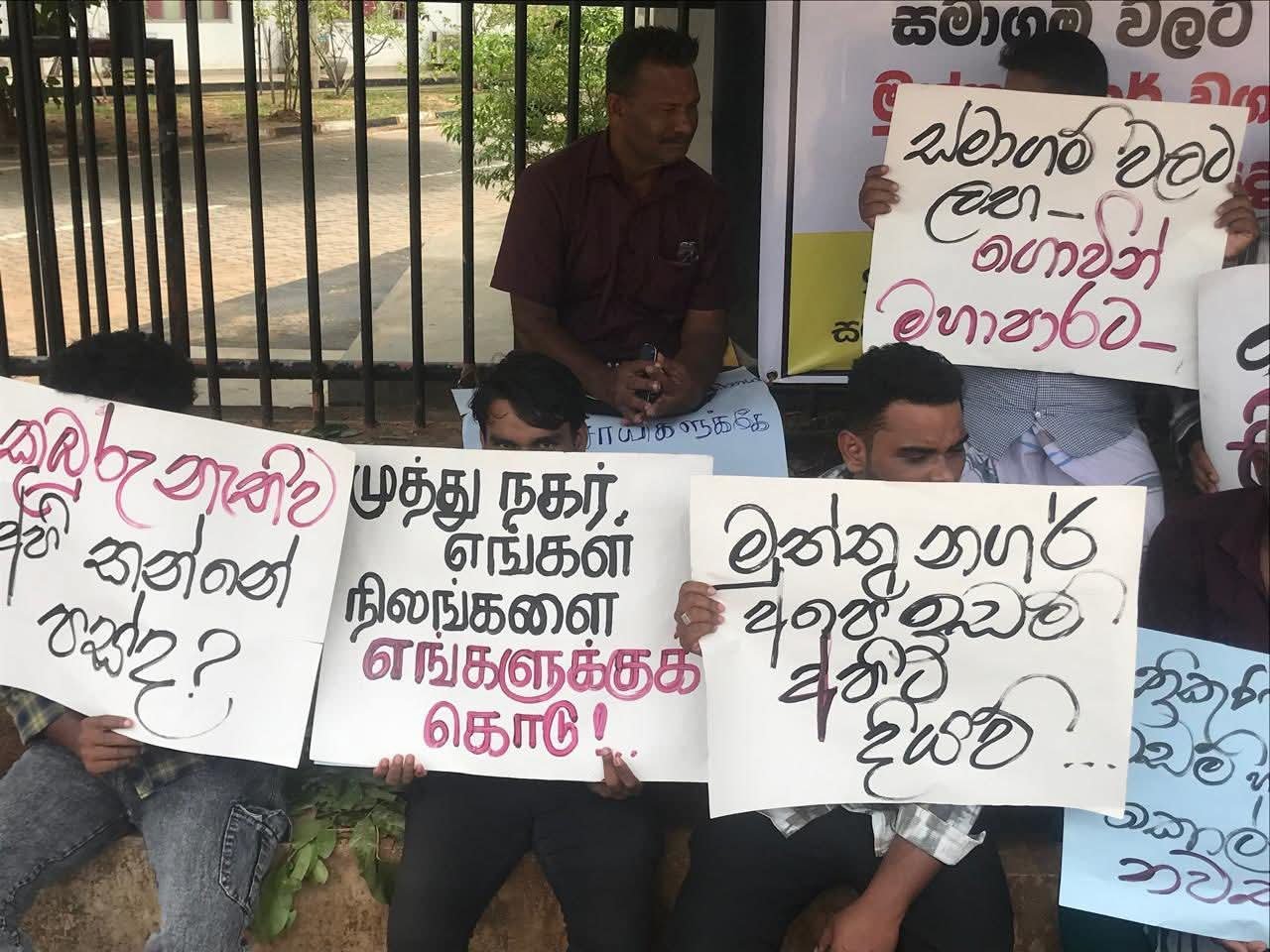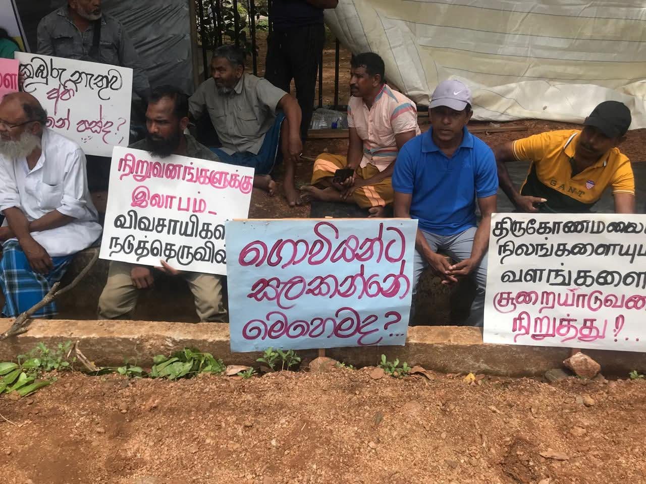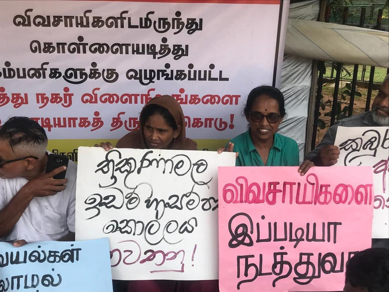 “விவசாயிகளிடமிருந்து கொள்ளையடித்து கம்பனிகளுக்கு வழங்கப்பட்ட முத்து நகர் விளைநிலங்களை உடனடியாகத் திருப்பிக் கொடு!” “இந்தியக் கம்பனிகளின் நில மற்றும் வளச் சூறையாடலுக்கு எதிரான போராட்டத்தைத் தொடங்குவோம்!” போன்ற பதாகைகளை ஏந்தியவாறு சத்தியாக்கிரக போராட்டத்தில் குதித்துள்ளனர்.