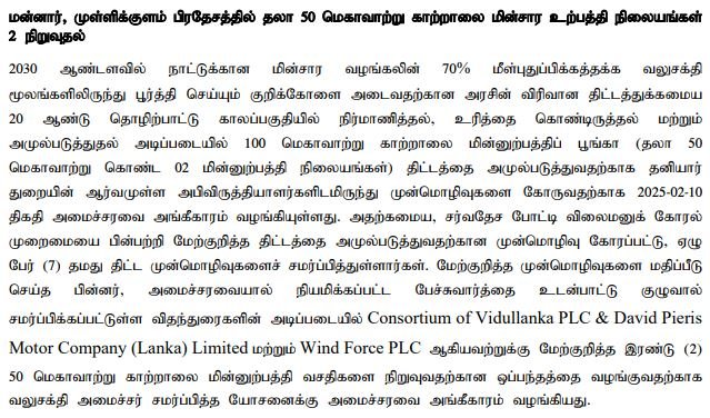 மன்னார், முள்ளிக்குளம் பிரதேசத்தில் தலா 50 மெகாவாற்று காற்றாலை மின்சார உற்பத்தி நிலையங்கள் இரண்டை நிறுவுவதற்கான ஒப்பந்தத்தை இரு நிறுவனங்களுக்கு வழங்குவதற்கு அமைச்சரவை அங்கீகாரம் வழங்கியுள்ளது.