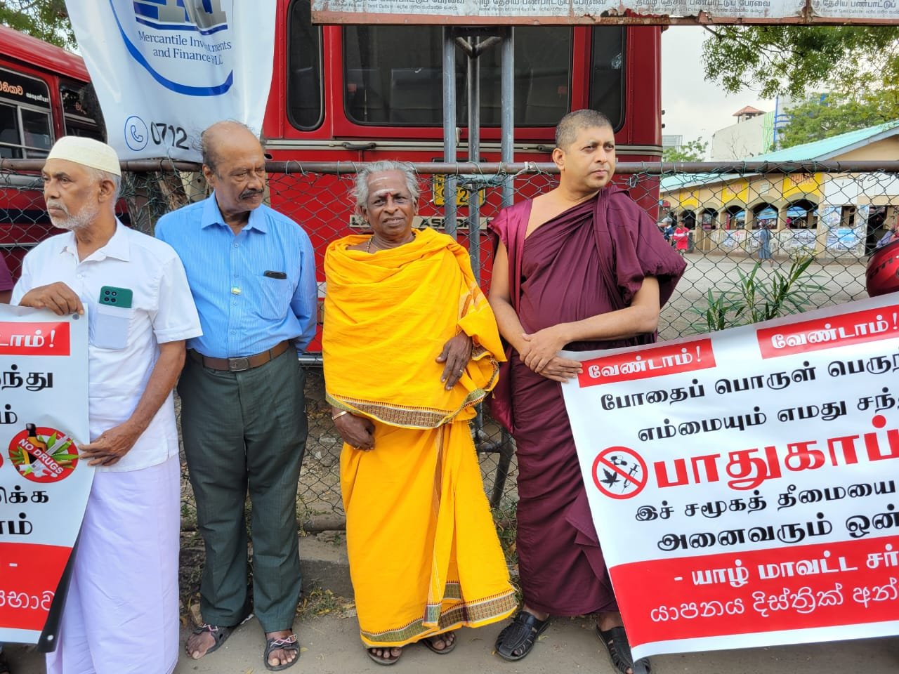 ‘போதைப் பொருள் பெருந்தீமையிலிருந்து எம்மையும், எமது சந்ததியினரையும் பாதுகாப்போம்’ எனும் தொனிப்பொருளில் நேற்று பிற்பகல் யாழ்ப்பாணம் மத்திய பேரூந்து நிலையத்திற்கு முன்பாக யாழ் மாவட்ட சர்வமத பேரவையின் ஏற்பாட்டில் போராட்டம் இடம்பெற்றது.