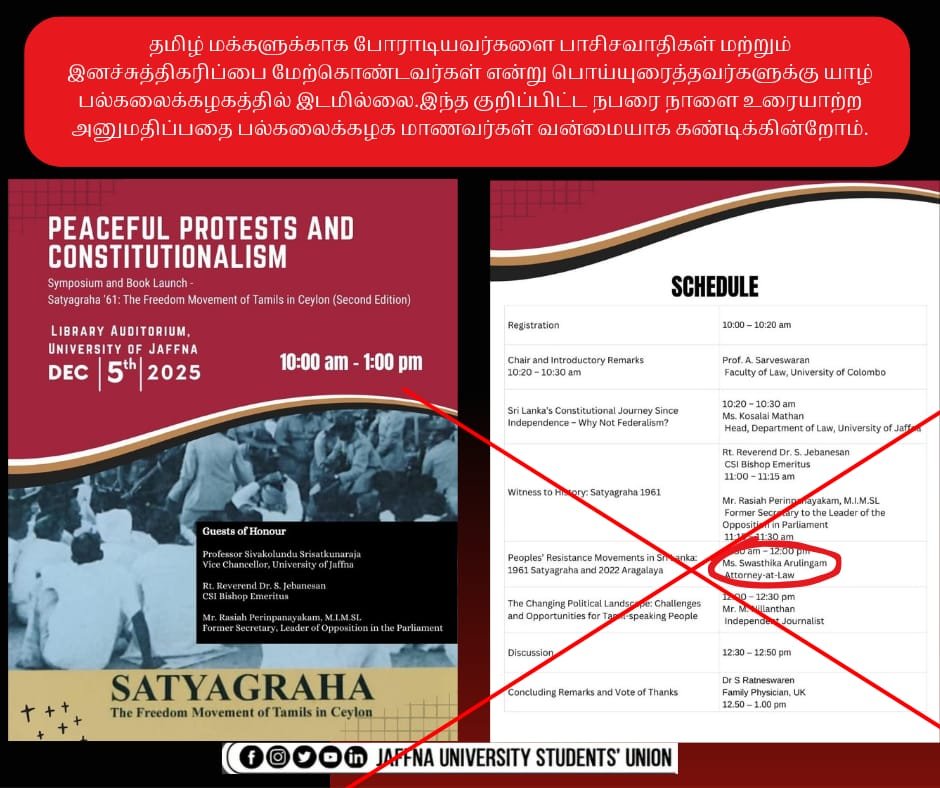 இந்த குறிப்பிட்ட நபரை நாளை சனிக்கிழமை உரையாற்ற அனுமதிப்பதை பல்கலைக்கழக மாணவர்கள் வன்மையாக கண்டிக்கின்றோம். ஏன் பல்கலைக்கழக சமூகமே கண்டிக்கின்றது.