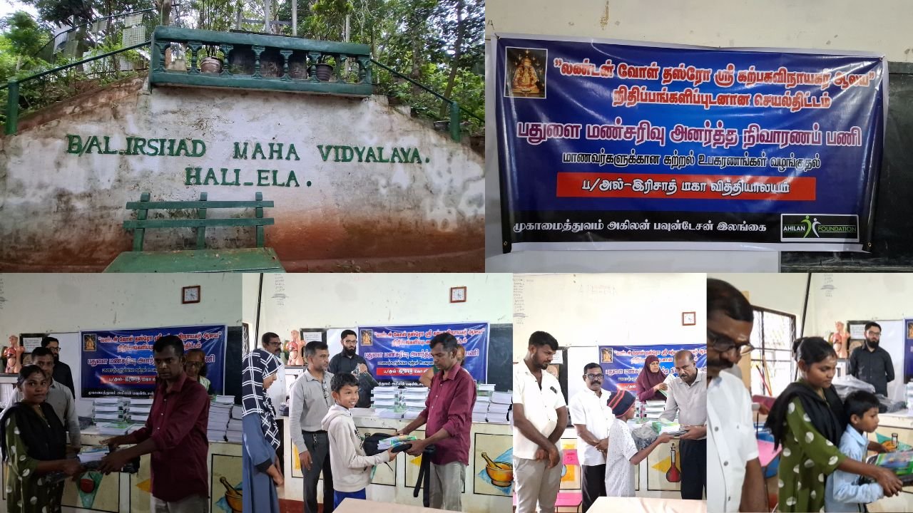 அகிலன் பவுண்டேசன் ஏற்பாட்டில் , இலண்டன் வோள் இஸ்ரோ ஸ்ரீ கற்பக விநாயகர் ஆலய நிதிப்பங்களிப்பில், அண்மையில் ஏற்பட்ட மண்சரிவில் கற்றல் உபகரணங்களை இழந்த, பதுளை மாவட்டம் அல்-இரிசாத் மகா வித்தியாலய மாணவர்களுக்கு, கற்றல் உபகரணங்கள் வழங்கும் நிகழ்வு இன்று புதன்கிழமை நடைபெற்றது.