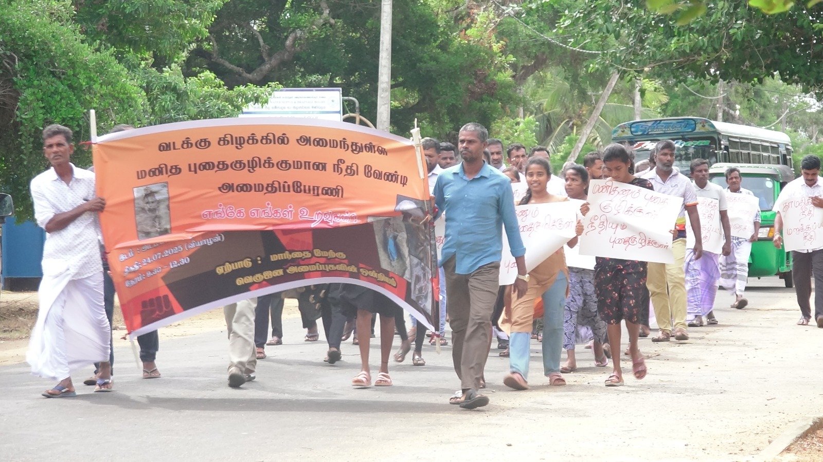 குறித்த பதாதைகளில் ‘எங்கே எங்கள் உறவுகள் எங்கே?,இலங்கை அசரே இது நாடா அல்லது இடு காடா?,வேண்டும் வேண்டும் சர்வதேச விசாரணை வேண்டும்,மனிதனும் புதை குழிக்குள் நீதியும் புதை குழிக்குள்ளா?,சர்வதேசமே மௌனத்தை கலை’ உள்ளிட்ட பல்வேறு வசனங்கள் எழுதப்பட்ட பதாகைகளுடன் அடம்பனியில் இருந்து திருக்கேதீஸ்வரம் மாந்தை மனித புதைகுழி நோக்கி ஊர்வலமாக வருகை தந்தனர்.