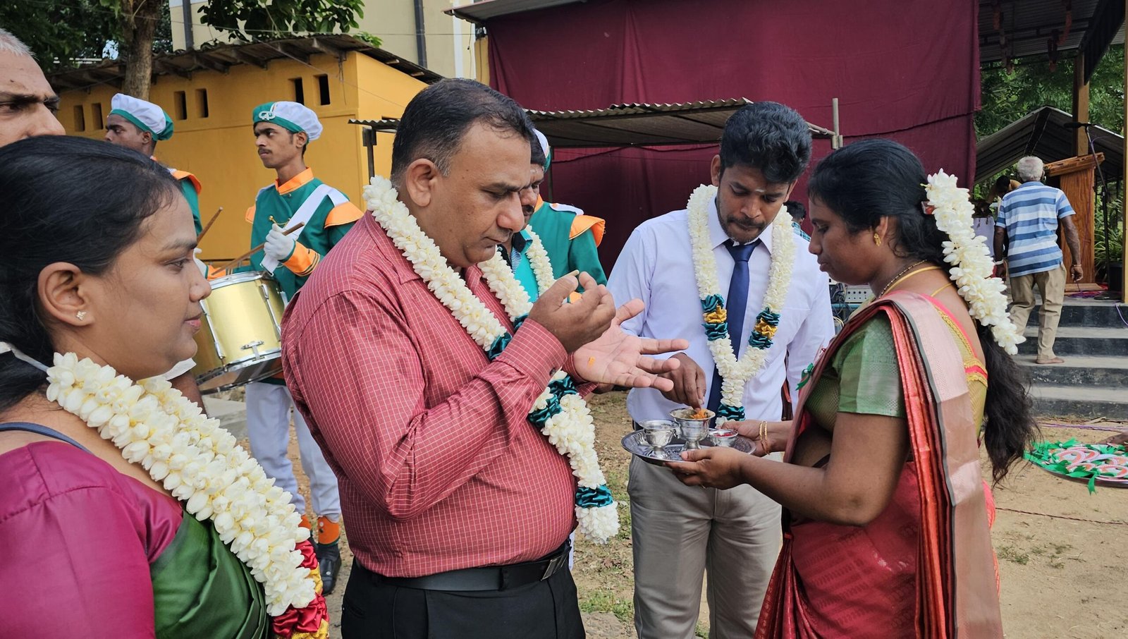 பின்னர் தேசியக் கொடி, பாடசாலைக் கொடி என்பன ஏற்றி வைக்கப்பட்டன. அதனைத் தொடர்ந்து விருந்தினர்களுக்கு மலர்மாலை அணிவிக்கப்பட்டது. பின்னர் மேற்கத்திய இசை வாத்தியங்கள் முழங்க விருந்தினர்கள் அழைத்து வரப்பட்டனர்.