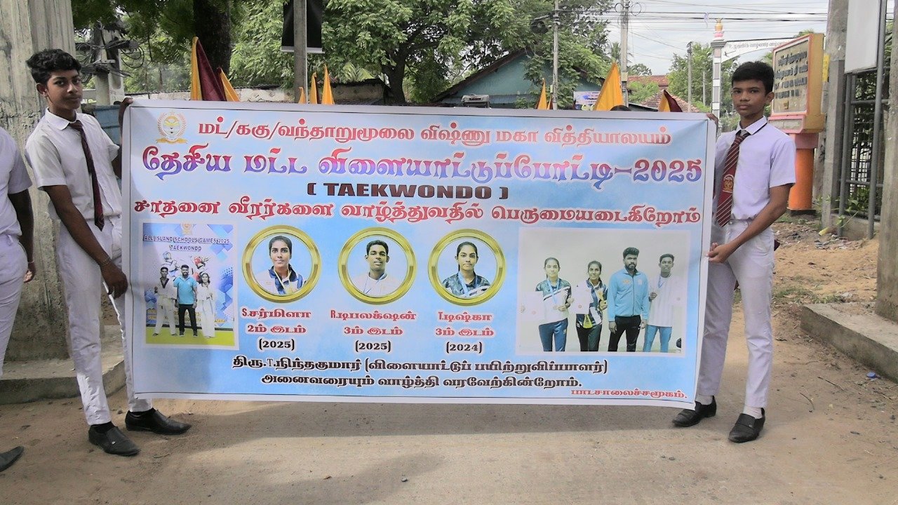 கடந்த 22,23,24 மற்றும் 25ம் திகதிகளில் மாத்தறை விளையாட்டு அரங்கில் இடம்பெற்ற பாடசாலைகளுக்கு இடையிலான தேசிய மட்ட விளையாட்டுப் போட்டியில் டேக்வாண்டே (TAEKWONDO) போட்டியில் மட்டக்களப்பு வந்தாறுமூலை விஷ்ணு மஹா வித்யாலயா மாணவர்கள் விளையாடி வெற்றியீட்டி ஒரு வெள்ளி பதக்கத்தினையும், ஒரு வெண்கல பதக்கத்தினையும் சுவீகரித்தனர்.