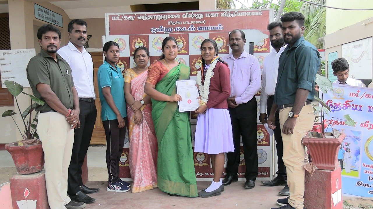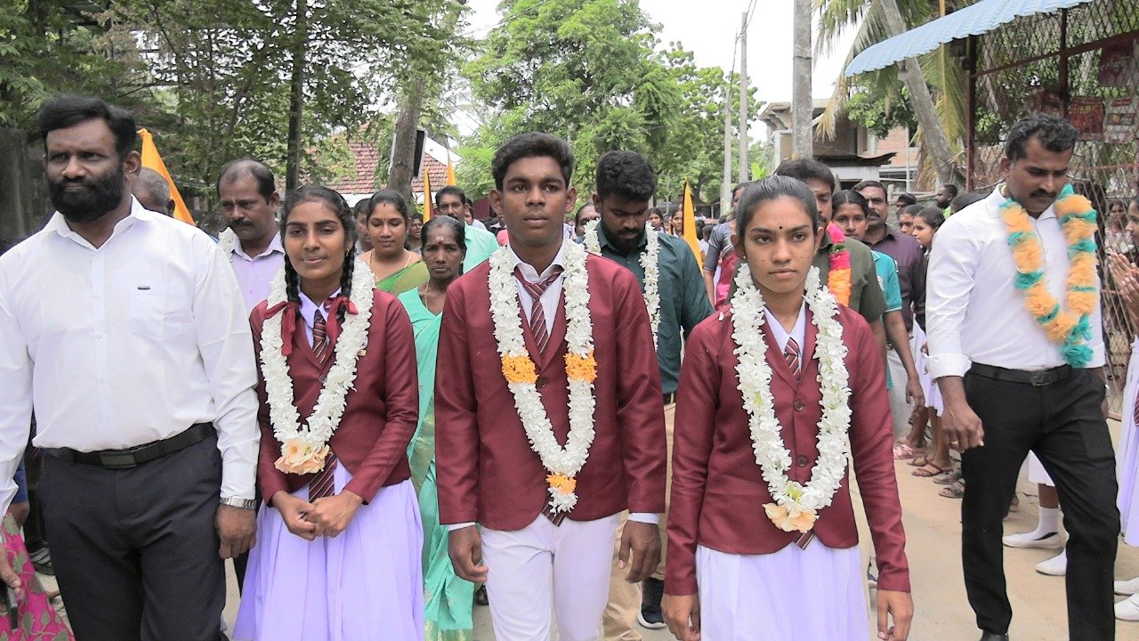 இவர்களை கௌரவிக்கும் முகமாக இன்றைய தினம் பாடசாலையின் நிர்வாகத்தின் ஏற்பாட்டில் வெற்றியீட்டிய மாணவர்களுக்கு மலர் மாலை அணிவித்து, அவர்கள் ஊர்வலமாக பாடசாலை வரை அழைத்து வரப்பட்டு மாணவர்களுடன் இணைத்து அவர்களின் பெற்றோர்களையும் கௌரவிக்கும் முகமாக வெற்றியீட்டிய மாணவர்களின் பெற்றோர்களின் கரங்களினால் அவர்களுக்கான சான்றுதல்களும், பதக்கங்களும் வழங்கி வைக்கப்பட்டது.