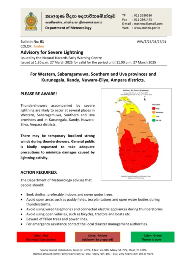 மேற்கு, சபரகமுவ, தெற்கு மற்றும் ஊவா மாகாணங்களிலும், குருநாகல், கண்டி, நுவரெலியா மற்றும் அம்பாறை மாவட்டங்களிலும் பல இடங்களில் இடியுடன் கூடிய மழை பெய்யும் என்று வானிலை ஆய்வு மையம் எச்சரித்துள்ளது.