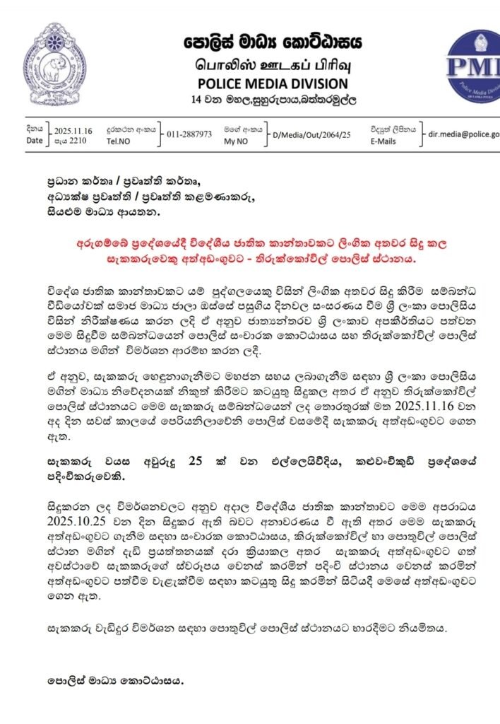 திருக்கோவிலில் பகுதியில் வைத்து வெளிநாட்டு சுற்றுலா பயணி ஒருவரை பாலியல் துன்புறுத்தலுக்கு உள்ளாக்கிய சம்பவம் தொடர்பான, வீடியோ சமூக ஊடகங்களில் வைரலானதை அடுத்து, சம்பவம் தொடர்பாக தேடப்பட்டு வந்த சந்தேக நபர் இன்று ஞாயிற்றுக்கிழமை பெரியநீலாவணை பொலிஸ் பிரிவில் வைத்து கைது செய்யப்பட்டுள்ளதாக, பொலிஸ் ஊடக அறிக்கையில் தெரிவிக்கப்பட்டுள்ளது.
