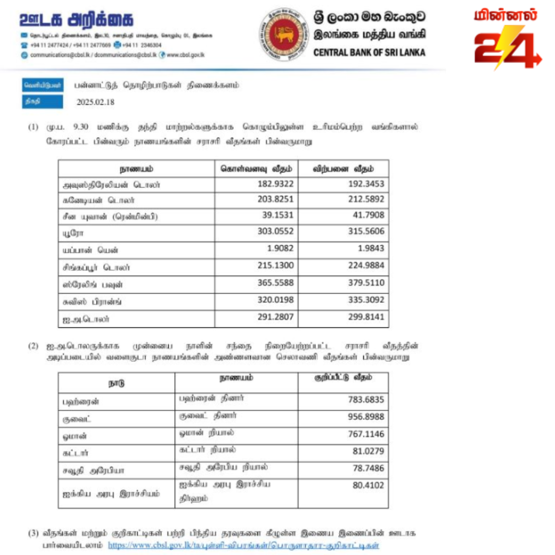 இலங்கை மத்திய வங்கி இன்று செவ்வாய்க்கிழமை வெளியிட்டுள்ள நாணயமாற்று வீதத்தின்படி,